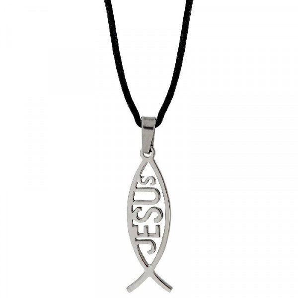 Trendige Kette mit schwarzen Lederband und Anhänger "Fisch/Jesus". Der Anhänger ist schön glänzend poliert.