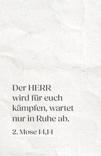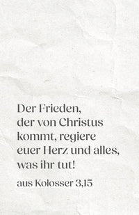 Dieses Set mit 25 Verteilkärtchen voller ermutigender Worte und Bibelverse trägt den Frieden Gottes in den Alltag. Die Karten laden dazu ein, Frieden weiterzugeben, Hoffnung zu schenken und sich an die Gegenwart Gottes zu erinnern. Zum Weitergeben an Feiern, Veranstaltungen, Gottesdiensten, zum Jahreswechsel oder einfach so zwischendurch - kleine Botschaften, die Herzen berühren.