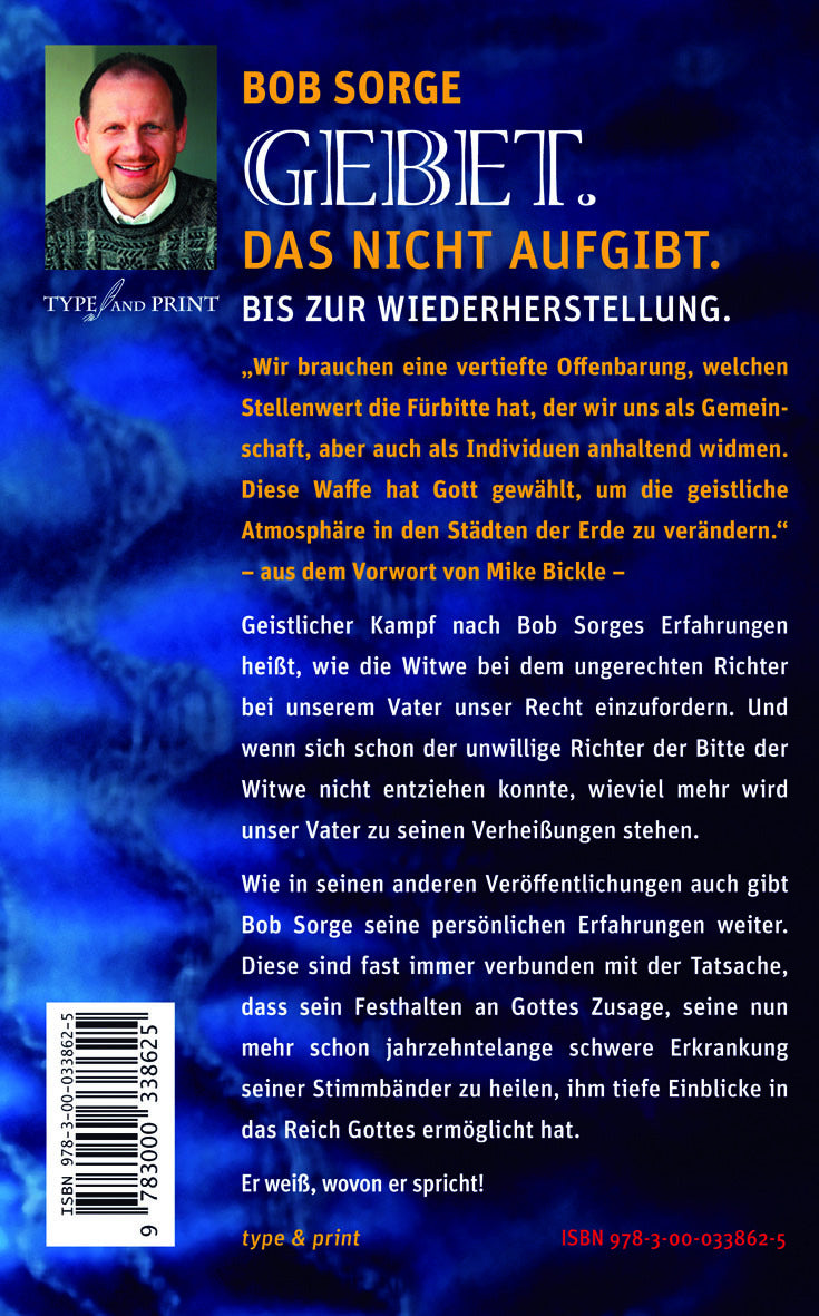 Geistlicher Kampf bedeutet nach Bob Sorges Erfahrungen, wie die Witwe bei dem ungerechten Richter bei unserem Vater unser Recht einzufordern. Wie in seinen anderen Veröffentlichungen auch gibt Bob Sorge seine persönlichen Erfahrungen weiter. Diese sind fast immer verbunden mit der Tatsache, dass sein Festhalten an Gottes Zusage, seine nun mehr schon jahrzehntelange schwere Erkrankung seiner Stimmbänder zu heilen, ihm tiefe Einblicke in das Reich Gottes ermöglicht hat. Bob weiß, wovon er spricht!