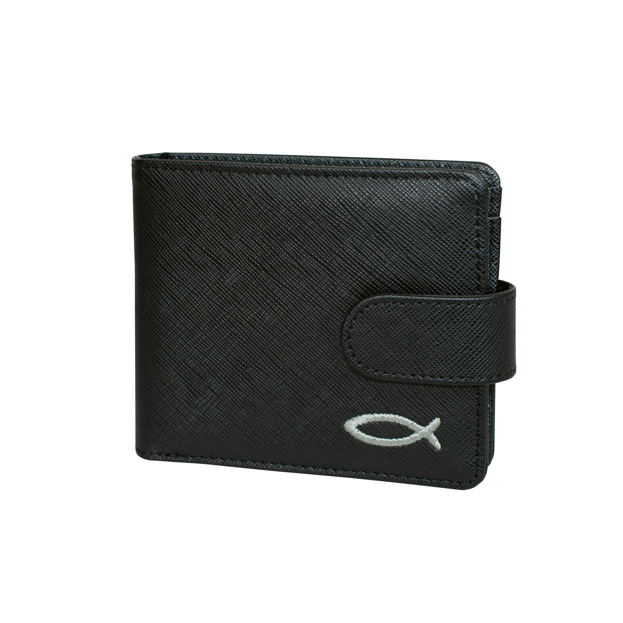 Herren-Geldbörse aus hochwertigem Kunstleder mit gesticktem Ichthys-Motiv, einzeln verpackt in Folie.