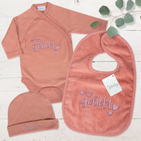 Das Baby-Lätzchen mit hochwertiger Stickerei "geliebt" und kleinen Herzen auf der samtigen Oberfläche ist ein liebevolles Geschenk zur Geburt oder Taufe.