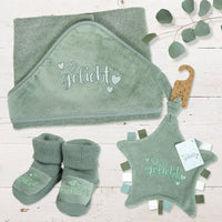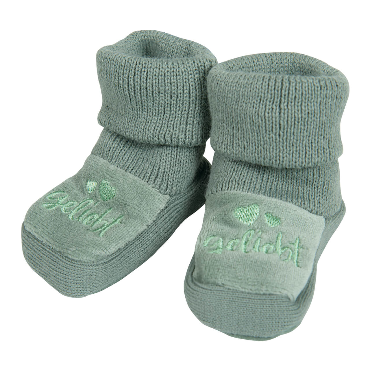 Gemütliche Baby-Söckchen in salbei aus weichem Ripp-Jersey niedlich bestickt mit "geliebt" und kleinen Herzen. Ein besonders liebevolles Geschenk zur Geburt oder Taufe (auch in altrose unter der Nr. 6497084 erhältlich).