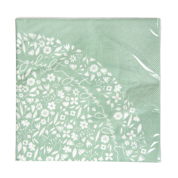 Schöne Servietten im Allover-Blümchen-Design in der Trendfarbe salbeigrün. Die Worte "geliebt - getragen - gesegnet" sind in geschwungener Schrift miteinander verbunden.