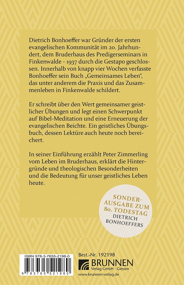 Er schreibt über den Wert gemeinsamer geistlicher Übungen und legt einen Schwerpunkt auf Bibel-Meditation und eine Erneuerung der evangelischen Beichte. Ein geistliches Übungsbuch, dessen Lektüre auch heute noch bereichert und das jeder gelesen haben sollte, der in der Gemeinschaft mit anderen Christen lebt - sei es in einer Kommunität, in der Gemeinde, dem Hauskreis oder auch in der Familie.