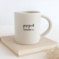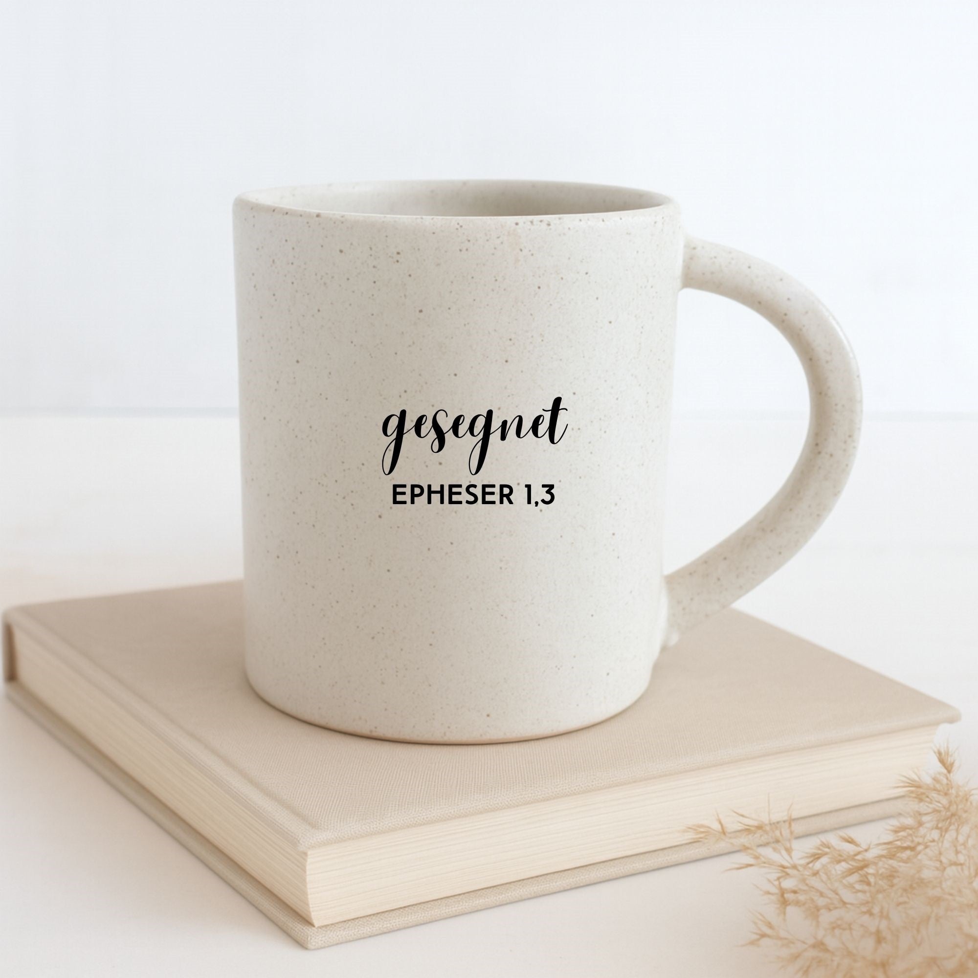 Diese liebevoll handgefertigte Steingut-Tasse mit reaktiver Sesamglasur und der Gravur "Gesegnet - Epheser 1,3" erinnert an Gottes reichen Segen: "Gepriesen sei der Gott und Vater unseres Herrn Jesus Christus, der uns gesegnet hat mit allem geistlichen Segen." Ein stilvoller Begleiter und eine tägliche Ermutigung, in Gottes Fülle zu leben.
