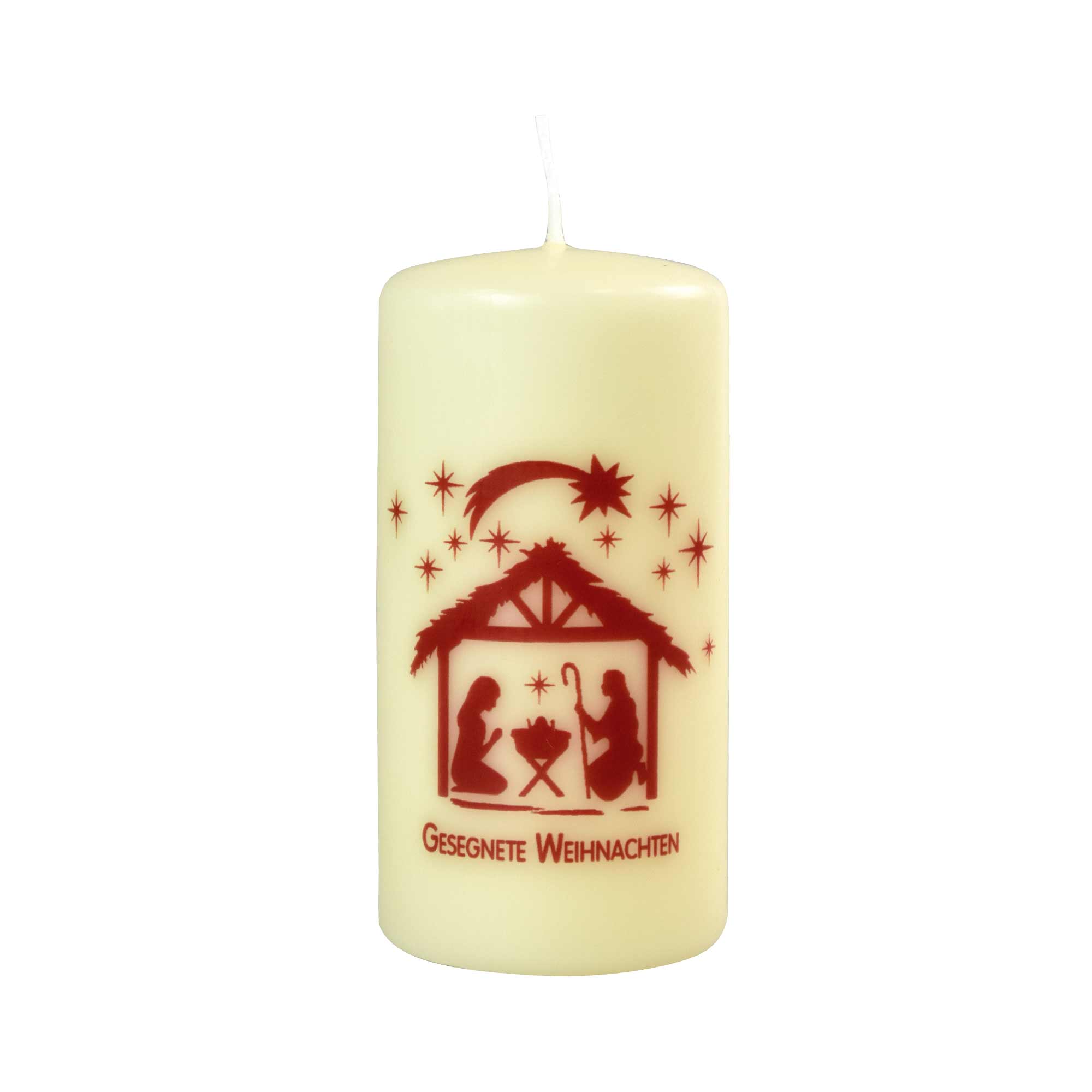 Handgearbeitete Qualitätskerze aus deutscher Kerzenmanufaktur, mit Druck Krippenmotiv und Text "Gesegnete Weihnachten", elfenbeinfarben, Höhe 12 cm, 6 cm, in Geschenkfolie verpackt.