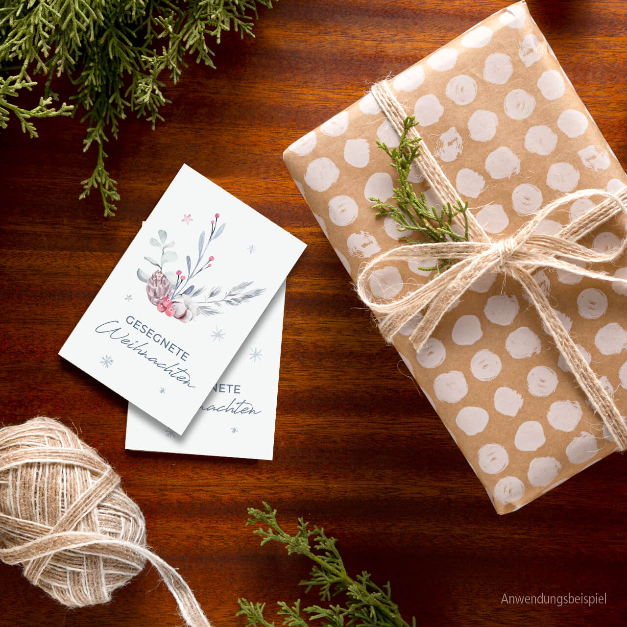 Die schönen Weihnachtskärtchen mit Weihnachtsmotiv "Gesegnete Weihnachten" sind ideal, um Geschenke für die Liebsten zu schmücken. Dazu infach lochen und mit einem hübschen Band ans Päckchen binden.