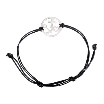 Hochwertiges Armband aus Textilbändern, Größe variabel einstellbar. Mittig rundes Element mit den Symbolen Kreuz, Anker und Herz für Glaube Hoffnung Liebe aus glänzendem 925 Sterlingsilber.