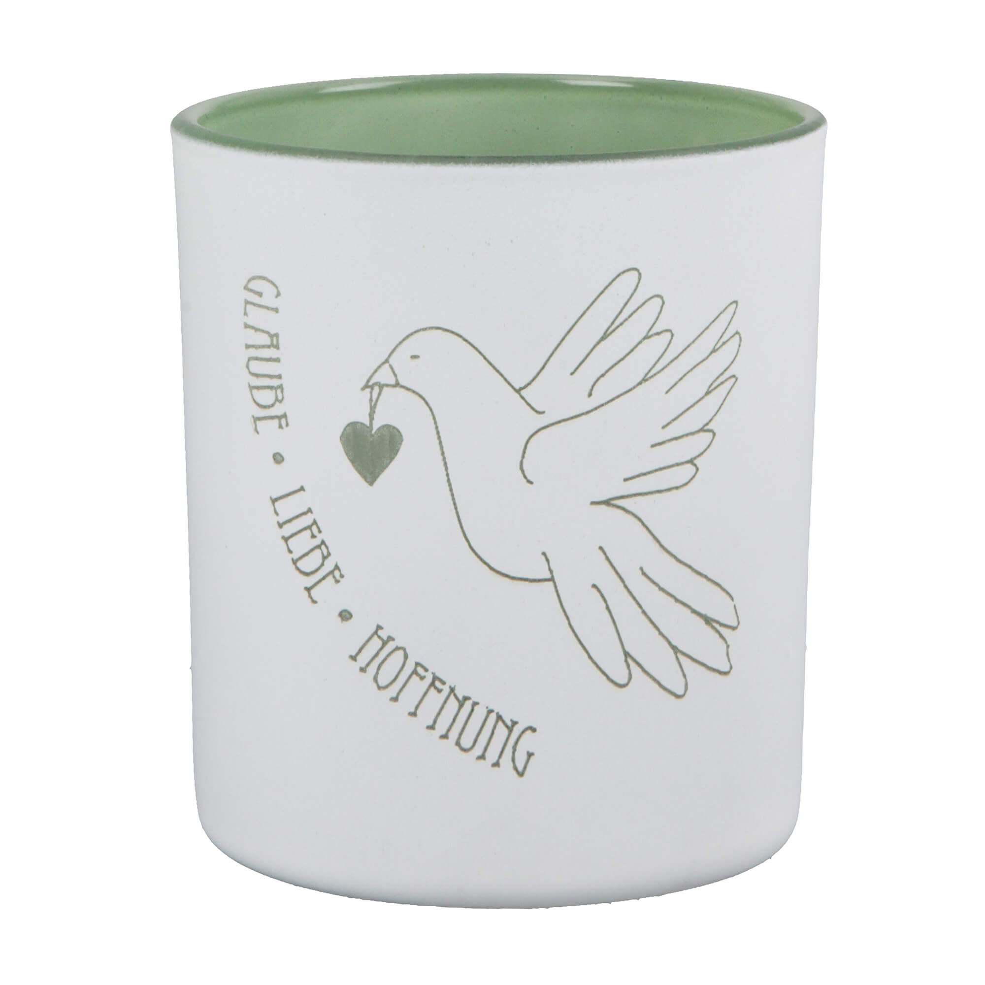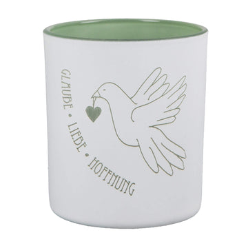 Dekoratives Windlicht "Glaube, Liebe, Hoffnung" aus Glas mit bezauberndem Tauben-Motiv. Schafft mit sanftem Kerzenlicht zu Hause eine gemütliche Stimmung, die zum Entspannen einlädt.