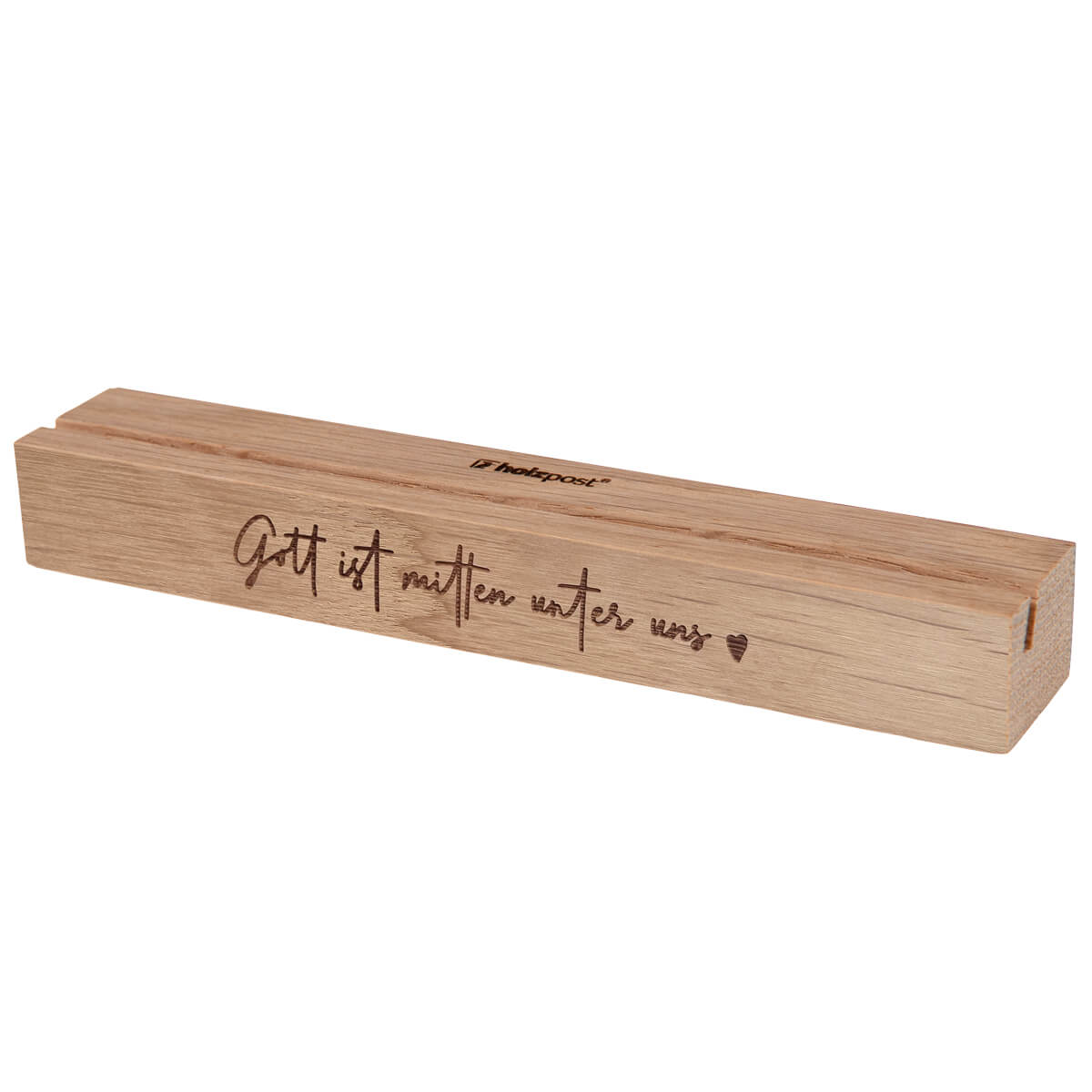 Kartenleiste aus Eichenholz, veredelt mit Lasergravur: "Gott ist mitten unter uns".