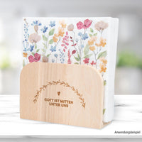 Zu allen Mahlzeiten wird der Tisch gedeckt. Dieser schöne Servietten-Ständer aus Buchenholz, veredelt mit der Lasergravur "Gott ist mitten unter uns", bleibt auf dem Tisch stehen.