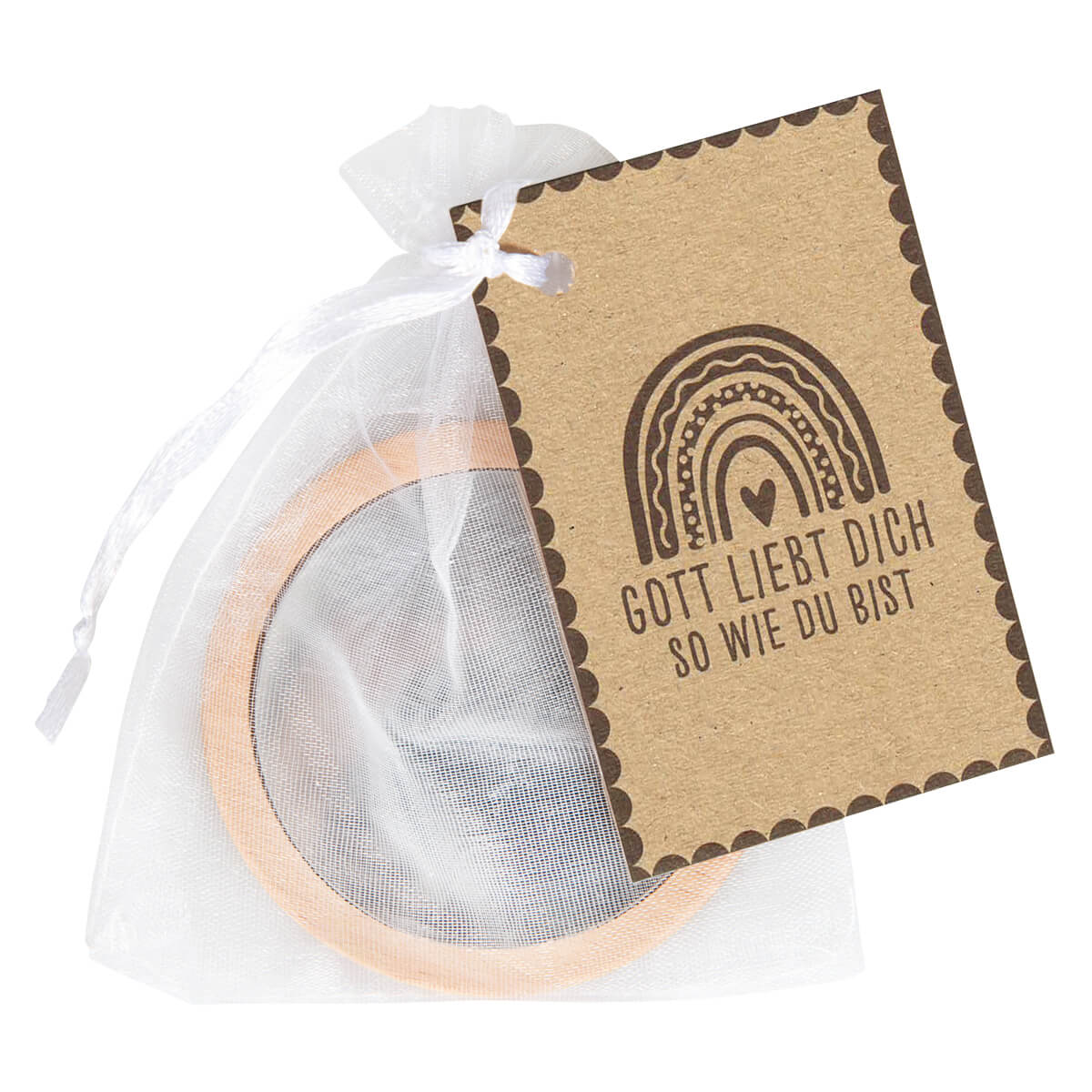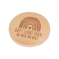 Kleiner Taschenspiegel "Regenbogen" aus Holz mit Text gelasert: Gott liebt dich so wie du bist