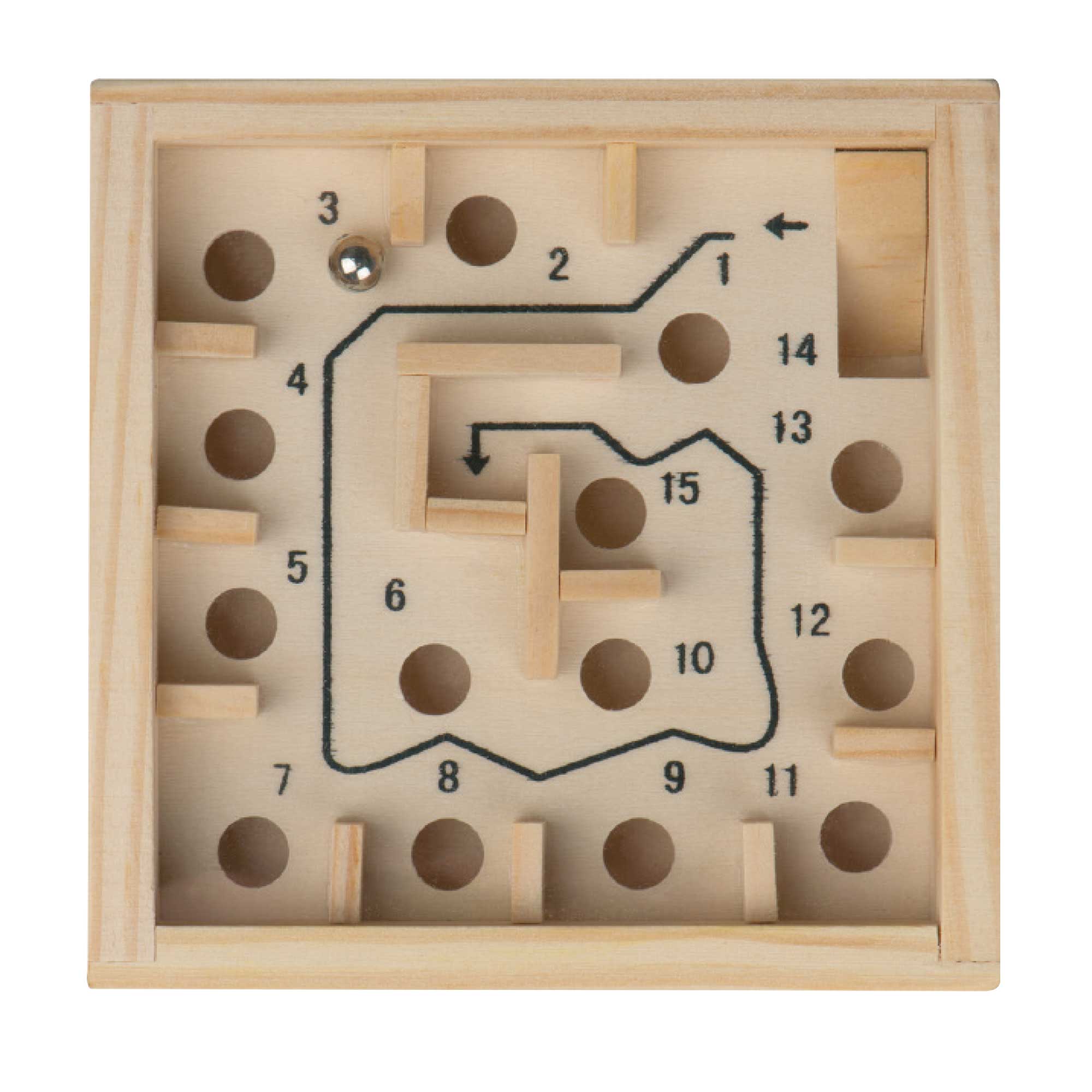 Bei dem Geduldspiel aus Holz soll die kleine Metallkugel durch das Labyrinth gesteuert werden, ohne dass in eines der Löcher fällt. Bedruckt ist das Spiel an der Seite mit dem Text "Gott schenke dir Geduld und Mut - Röm 15,5".