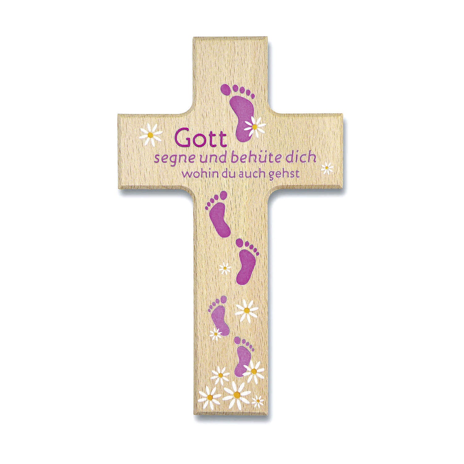 Kreuz aus Buchenholz mit farbigem Aufdruck "Gott segne und behüte dich wohin du auch gehst", Größe 9 x 15 cm
