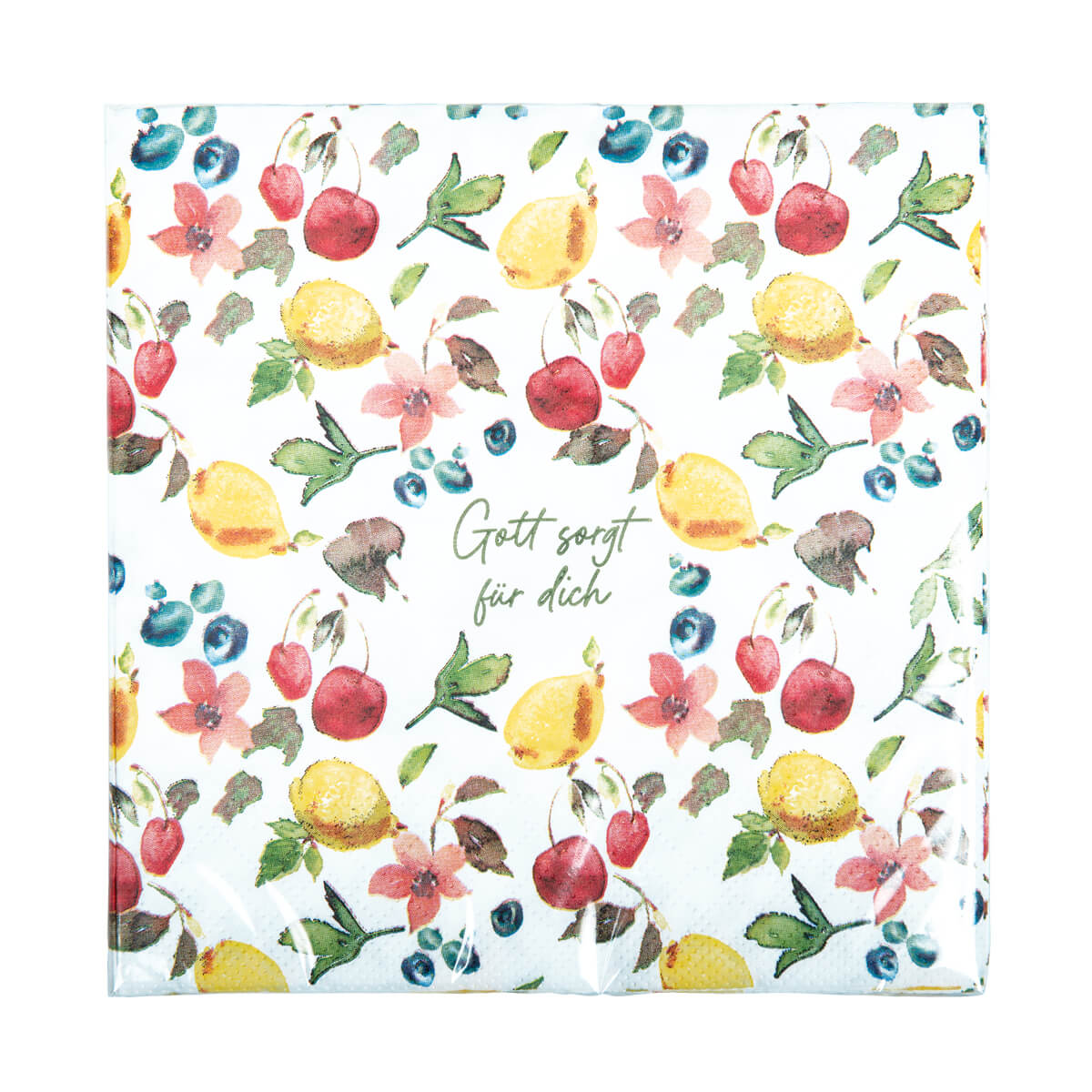Die schönen Servietten mit dem vollflächigen Sommerfrüchte-Motiv und dem Text "Gott sorgt für dich" sind eine ansprechende Tisch-Deko oder ein beliebtes Mitbringsel.