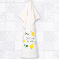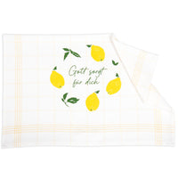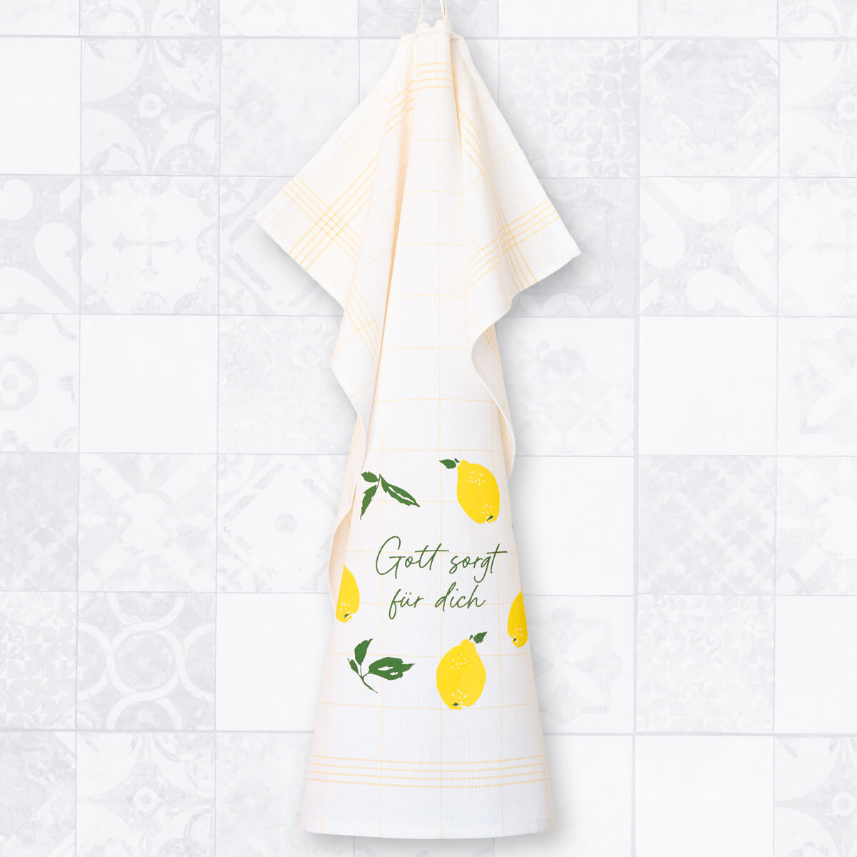 Eine sommerlich-frische Geschenkidee, passend zur neuen Serie: Das gelb karierte Geschirrtuch, zweifarbig bedruck mit Zitronen und dem Text "Gott sorgt für dich".