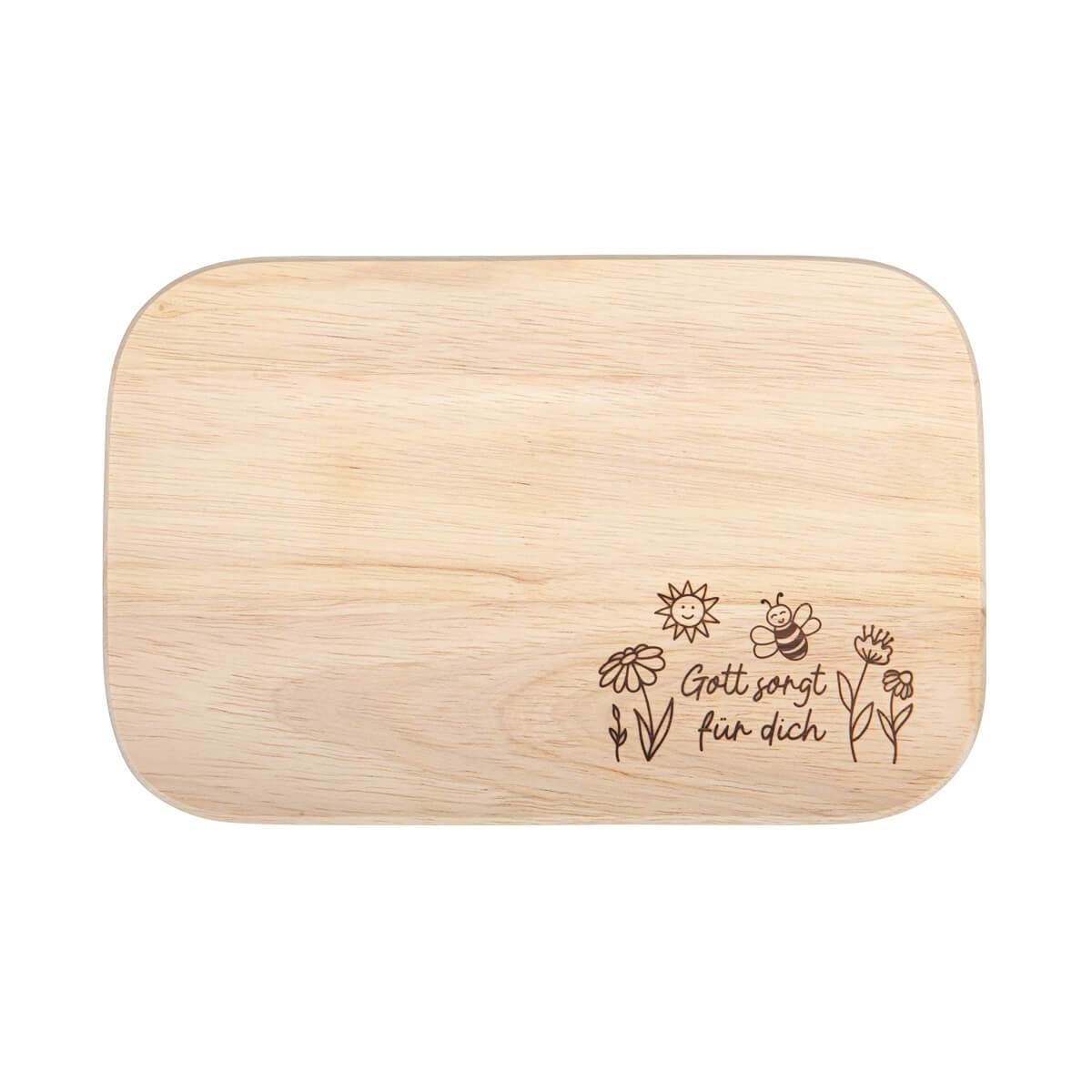 Schönes Holzbrettchen in bewährter Qualität aus robustem Hartholz. Veredelt mit Lasergravur "Gott sorgt für dich", umrahmt von Blumen, Sonne und Biene.