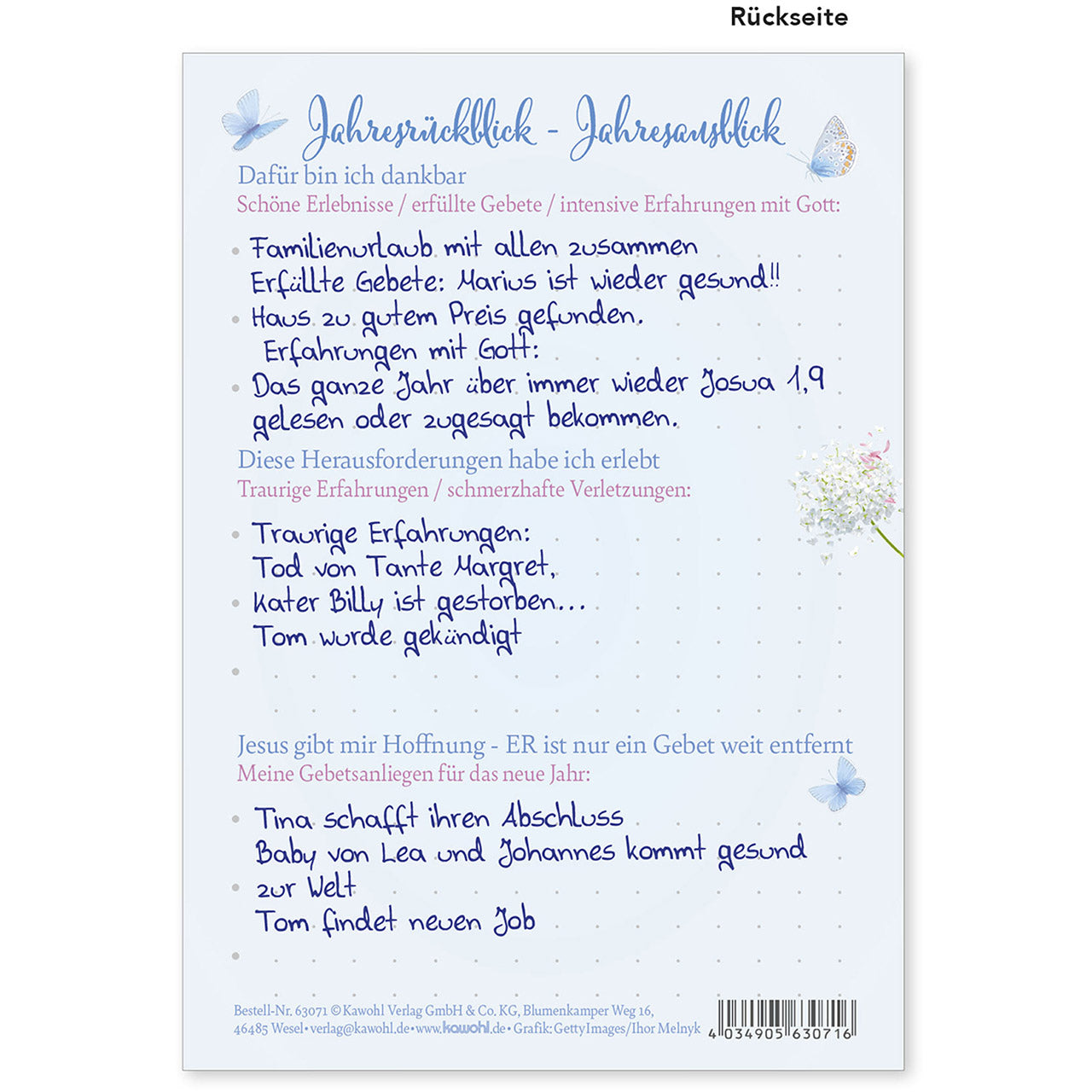 Das Ende des Jahres ist eine wunderbare Gelegenheit, innezuhalten und die Ereignisse der letzten 12 Monate zu reflektieren. Unsere stilvoll gestalteten Karten bieten auf der Rückseite Platz, um die Höhepunkte sowie die schwierigen Momente festzuhalten und Gebete für das bevorstehende Jahr zu notieren. Ein ermutigender Bibelvers auf der Vorderseite schenkt Ihnen immer wieder neue Kraft.
