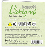 Ein kleiner Lichtgruß mit einer passenden Faltkarte (Format 9 x 9 cm). Das Teelicht ist auf besondere Weise veredelt. Beim Abbrennen schwimmt die Botschaft auf dem flüssigen Wachs und bleibt so - bis auf ein kleines Loch um die Flamme herum - sichtbar.