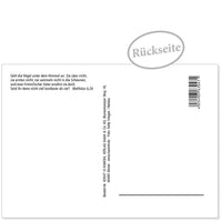 Seht die Vögel unter dem Himmel an: Sie säen nicht, sie ernten nicht, sie sammeln nicht in die Scheunen; und euer himmlischer Vater ernährt sie doch. Seid ihr denn nicht viel kostbarer als sie?