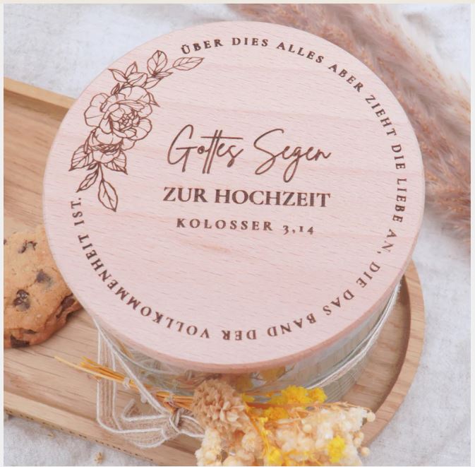 Aus einem einfachen Vorratsglas wird eine liebevolle Erinnerung: Unser hochwertiges Glas mit spülmaschinenfester Qualität und einem massiven Holzdeckel aus warmer Buche schenkt nicht nur Ordnung, sondern auch Geborgenheit. Die feine Gravur auf dem Deckel macht es zu einem besonderen Herzensgeschenk zur Hochzeit - voller Liebe und Segen für den gemeinsamen Weg.