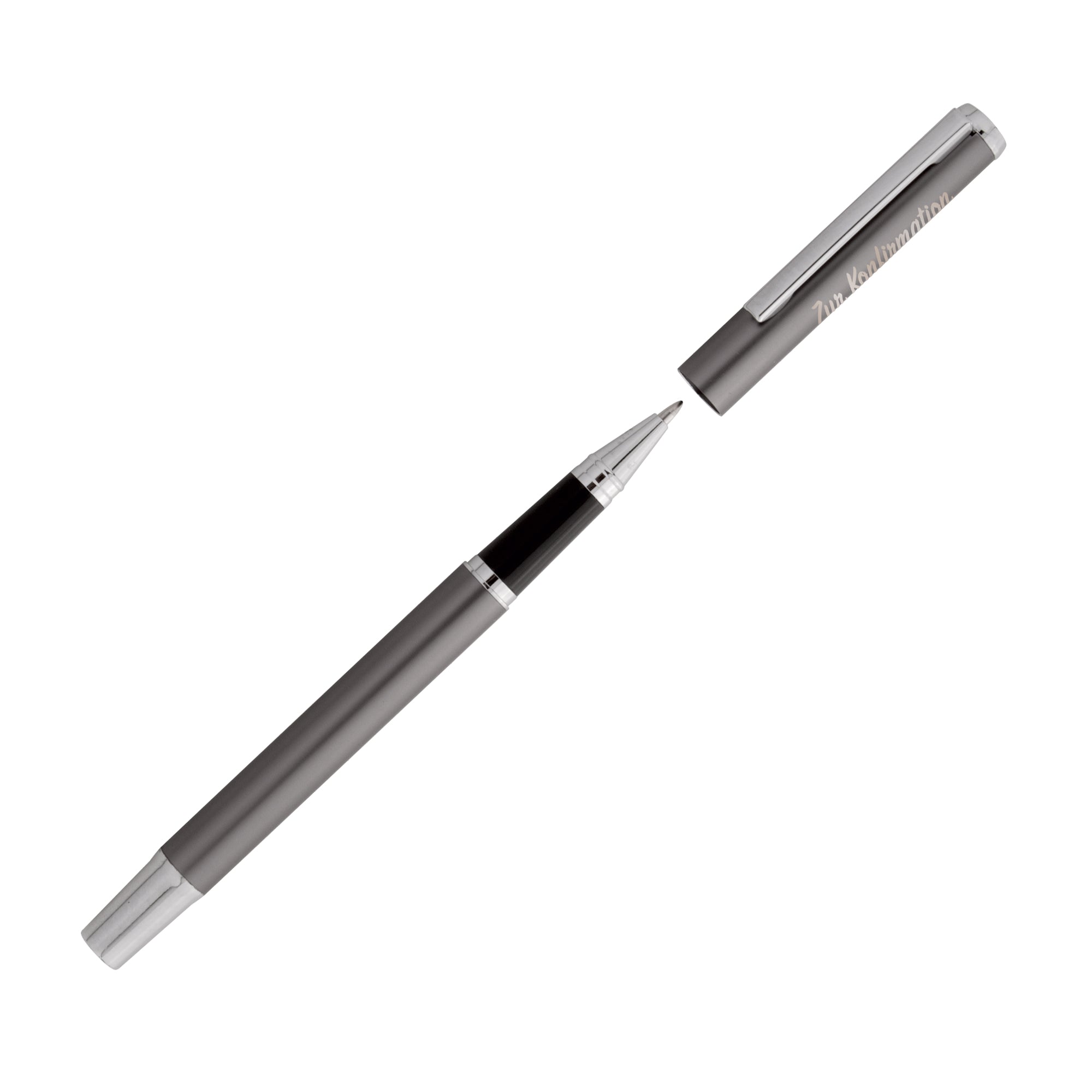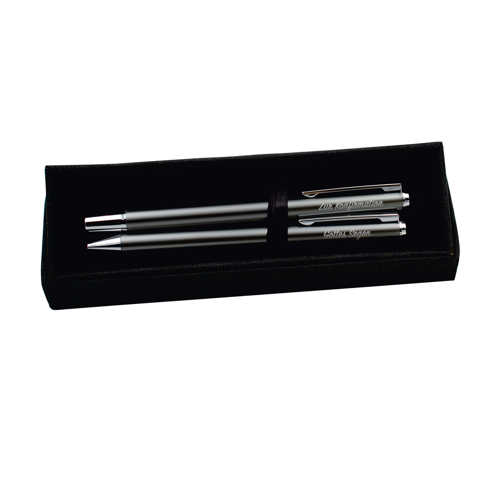 Elegantes Schreibset aus recyceltem Aluminium veredelt mit zwei Gravuren. Der eine Stift ist mit "Gottes Segen" graviert, der andere mit "Zur Konfirmation".