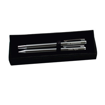 Das edle Set besteht aus einem Kugelschreiber und einem Rollerball-Stift, beide blauschreibend.
