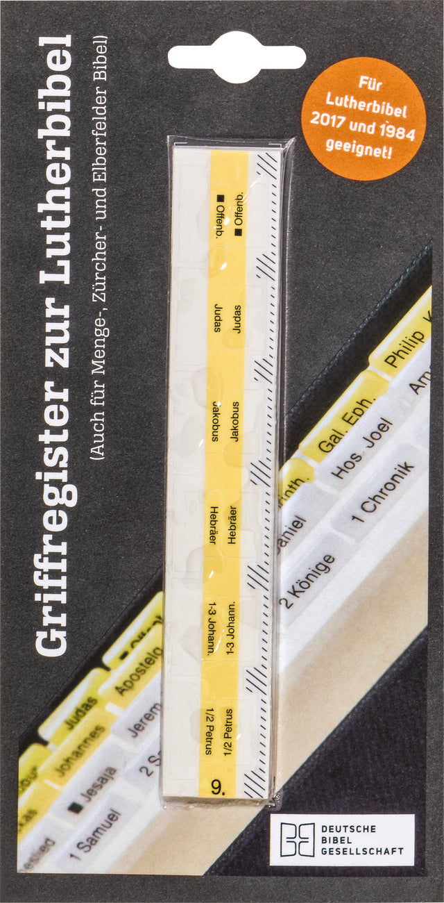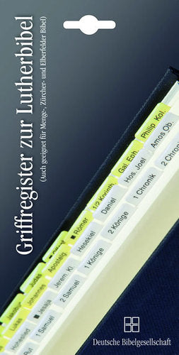 Wo steht noch gleich der Phillipperbrief? Wer mit einem Griff das gewünschte Buch in der Bibel finden will für den ist ein Griffregister das richtige Hilfsmittel. Strapazierfähige kleine Registerfähnchen aus Kunststoff halten mindestens so lange wie eine Bibel die gerne und viel gelesen wird. Einmal hineingeklebt vereinfachen sie das Hin- und Herblättern und ermöglichen das rasche Nachschlagen von Querverweisen zu anderen biblischen Büchern.
