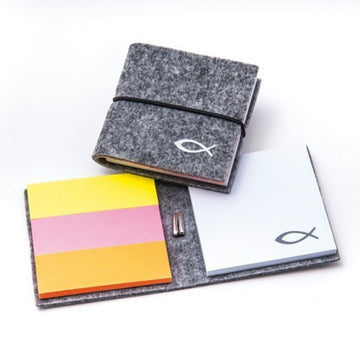 Haftnotizblock (Filzumschlag - grau, mit Fischlogo)