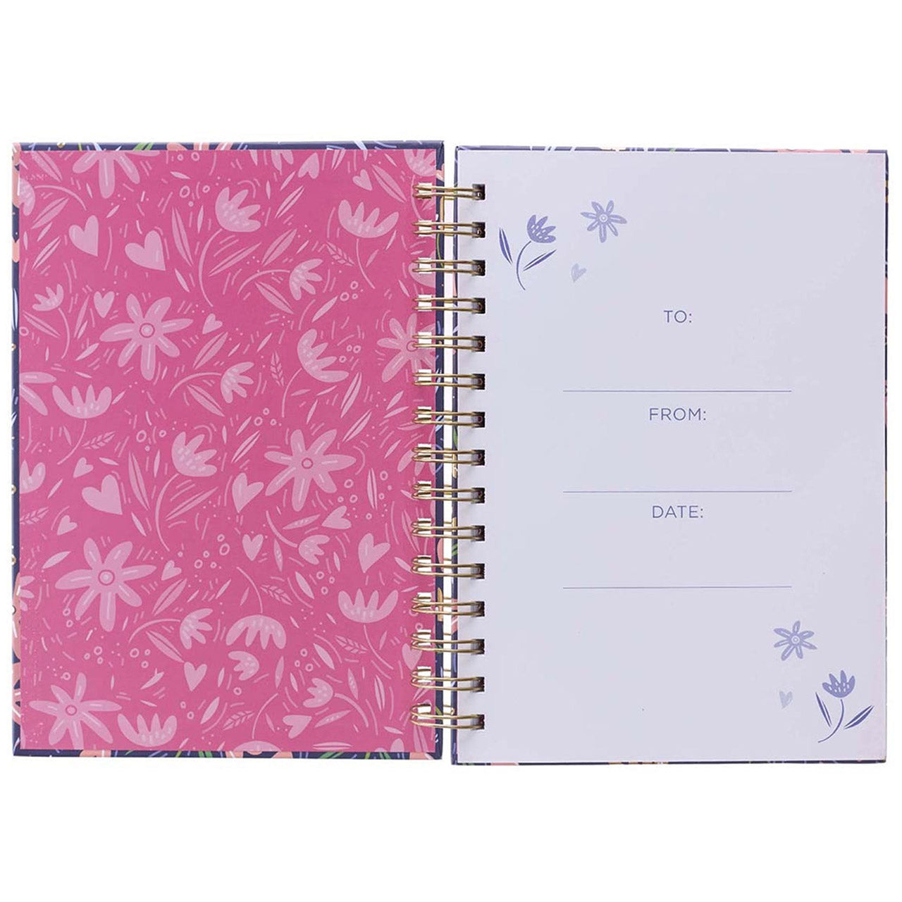 Hochwertiges Notizbuch mit praktischer Spiralbindung. So lassen sich die Seiten besonders leicht blättern und komplett umschlagen. Mit je einem englischen Bibelvers auf jeder linierten Seite. Strapazierfähiger Hardcover-Einband mit Motiv-Druck und -Prägung, teilweise mit Metallfolien-Akzenten. Extra-stabile Bindung mit beschichteter Drahtspirale.
