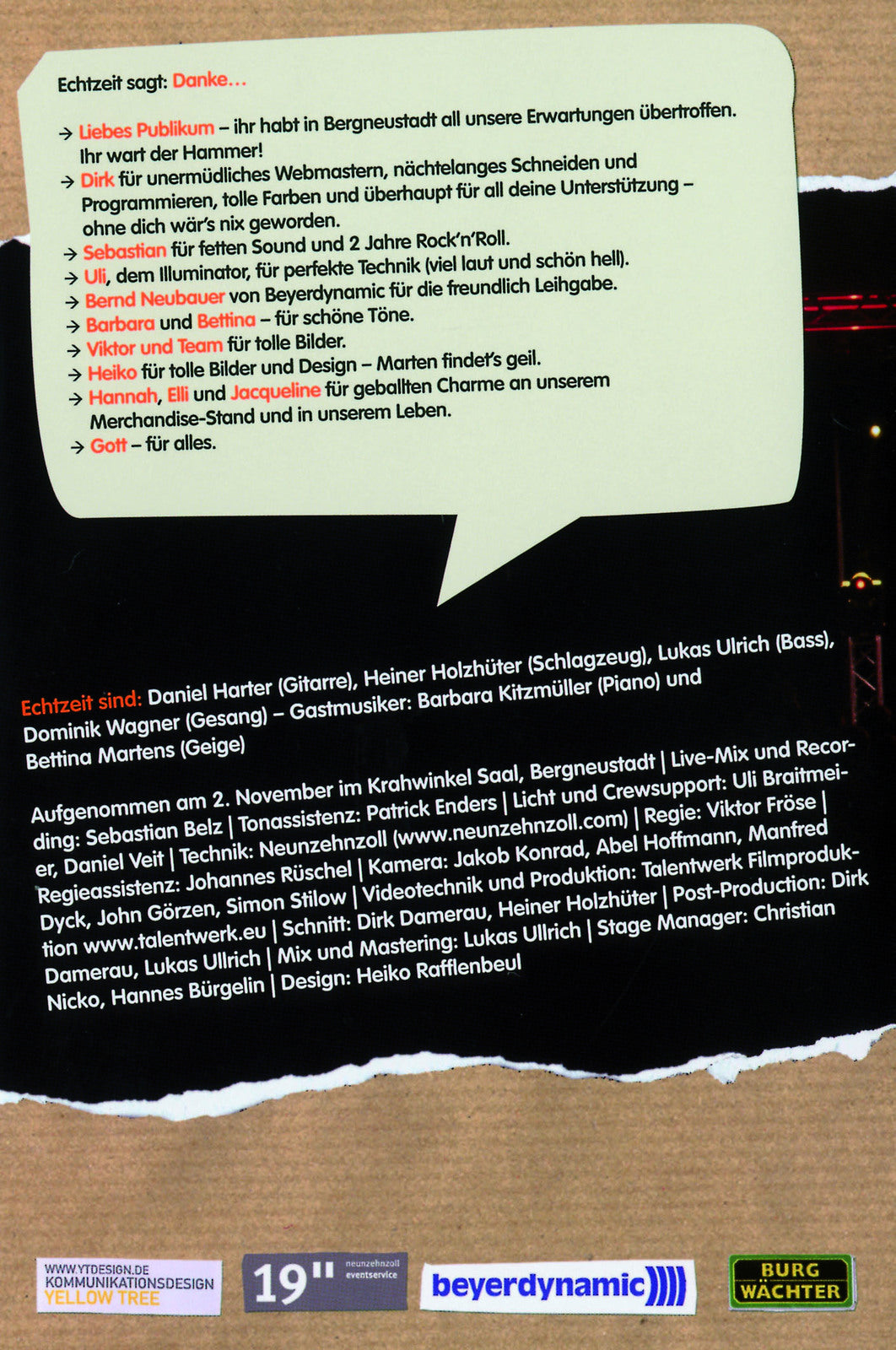 Das klingt vernünftig. Dachten sich die 4 Jungs von Echtzeit, holten sich Manuel Steinhoff und Uwe Sabirowsky (Beatsteaks) als Produzenten-Team ins Boot, und gingen zwei Jahre nach ihrem Debutalbum "Alles von vorne" mit 12 brandneuen Songs ins Studio. Herausgekommen ist eine erwachsenere CD, mit breiter musikalischer Palette. Glasklarer natürlicher Sound, dem man sich nicht entziehen kann und ebenso klare deutsche Texte bringen rüber, was den Jungs am Herzen liegt: rocken und grundehrlich von dem erzählen, was ihr Leben bewegt.