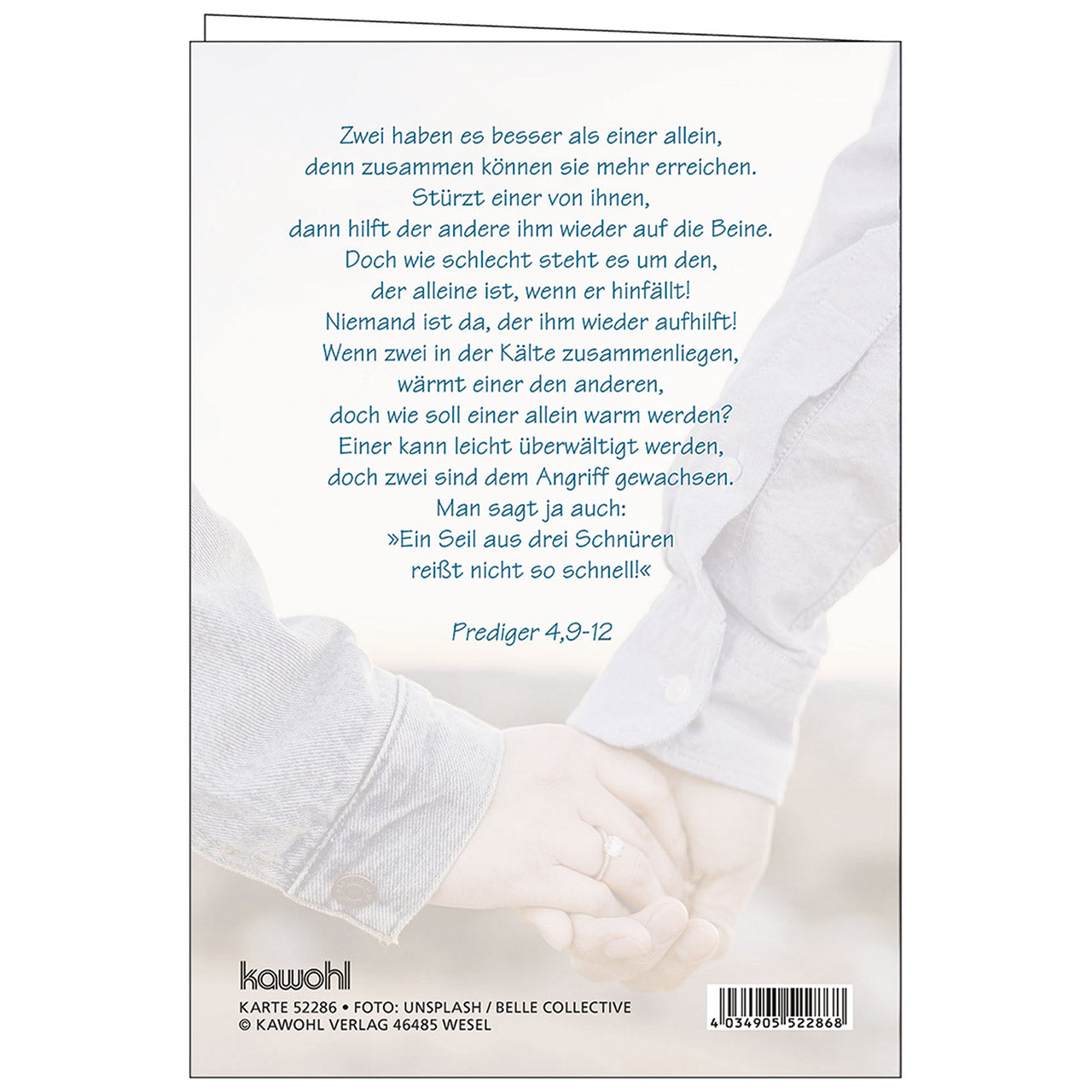 Zwei haben es besser als einer allein, denn zusammen können sie mehr erreichen. Stürzt einer von ihnen, dann hilft der andere ihm wieder auf die Beine. Doch wie schlecht steht es um den, der alleine ist, wenn er hinfällt! Niemand ist da, der ihm wieder aufhilft! Wenn zwei in der Kälte zusammenliegen, wärmt einer den anderen, doch wie soll einer allein warm werden? Einer kann leicht überwältigt werden, doch zwei sind dem Angriff gewachsen. Man sagt ja auch: "Ein Seil aus drei Schnüren reißt nicht so schnell!"