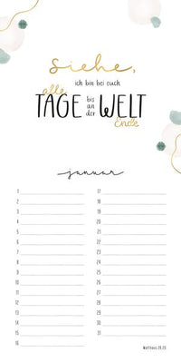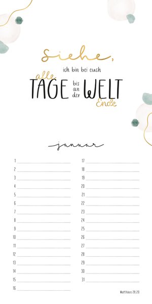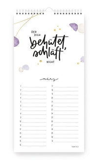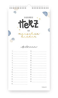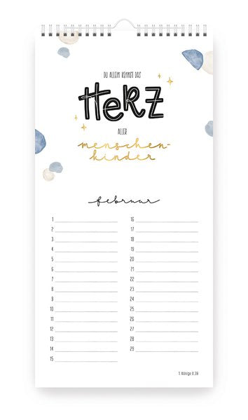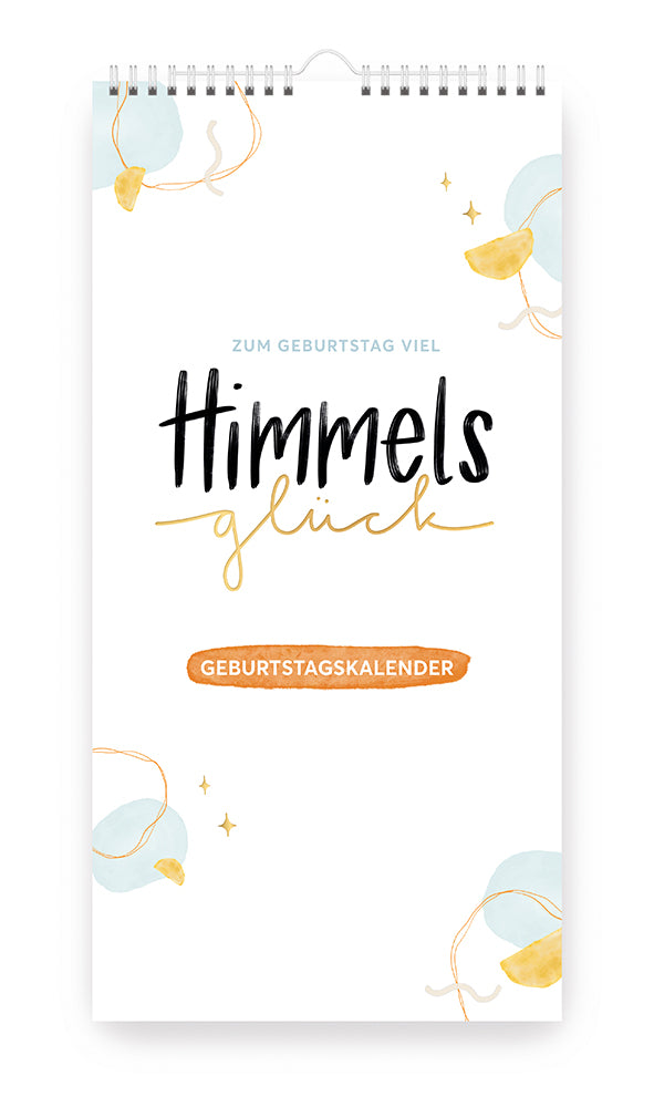 Dieser neue Geburtstagskalender verbindet 12 Bibelverse aus den "Himmelsglück"-Kalendern mit einem immerwährenden Kalendarium für Geburtstage. Jede Seite des Kalenders zieren handgezeichnete Aquarellmotive, kombiniert mit ausgewählten Bibelversen in kunstvollem Handlettering.
