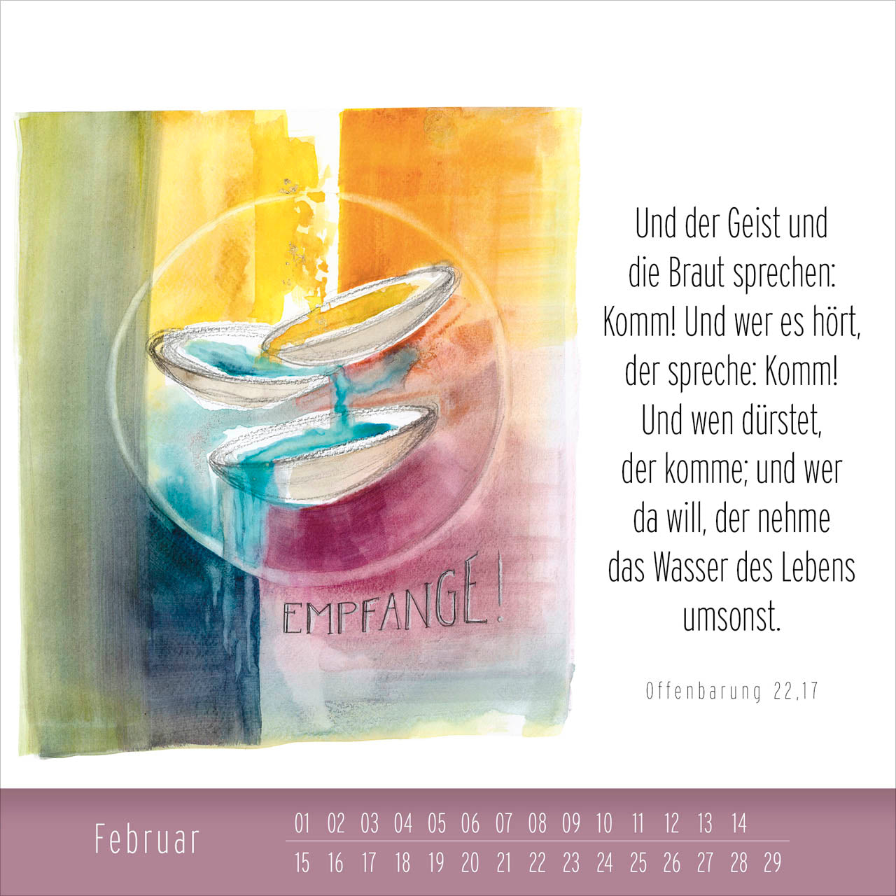 Es ist eine Freude, diesen Tischkalender mit einer Auswahl lebendiger und inspirierender Motive durchzublättern. Die Künstlerin Simone Riedel ist bekannt für ihre christliche Malerei. Dieser immerwährende Tischkalender ist mehr als nur ein Begleiter durch das Jahr. Ob als Geschenk oder für den eigenen Raum - dieser Kalender ist eine wunderschöne Möglichkeit, Kunst und Glauben auf stilvolle Weise zu verbinden. Lass dich von Simone Riedels farbenfrohen Aquarellen bereichern und erlebe jeden Tag aufs Neue die Kraft der christlichen Botschaft!