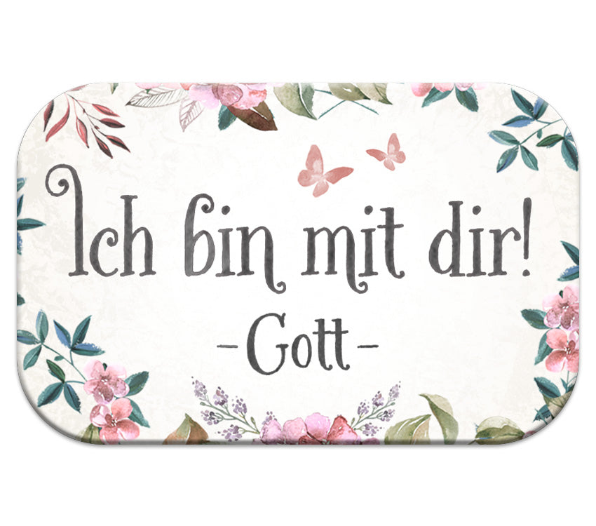Der Magnet und ein farbiges Kärtchen mit Bibelzitat auf der Rückseite sind zusammen in einer Folie verpackt.