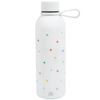 Die doppelwandige Vakuum-Trinkflasche ist aus recyeltem Edelstahl hergestellt und mit einer gummierten Beschichtung ausgestattet, inkl. Schraubdeckel und praktischer Silikon-Trageschlaufe. Auf dem Korpus ist ein Recycling-Logo eingraviert.