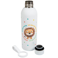 Edelstahl-Trinkflasche "Löwe". Trinken ist wichtig, besonders im Kindergarten und der Schule, bei Spiel und Sport.