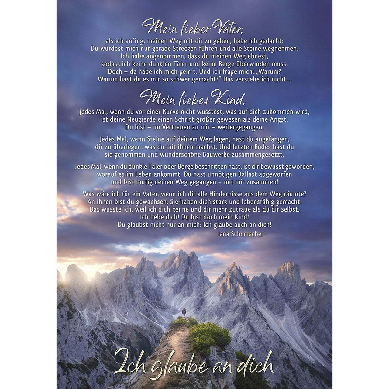 Was wäre ich für ein Vater, wenn ich dir alle Hindernisse aus dem Weg räumte? An ihnen bist du gewachsen. Sie haben dich stark und lebensfähig gemacht. Das wusste ich, weil ich dich kenne und dir mehr zutraue als du dir selbst.