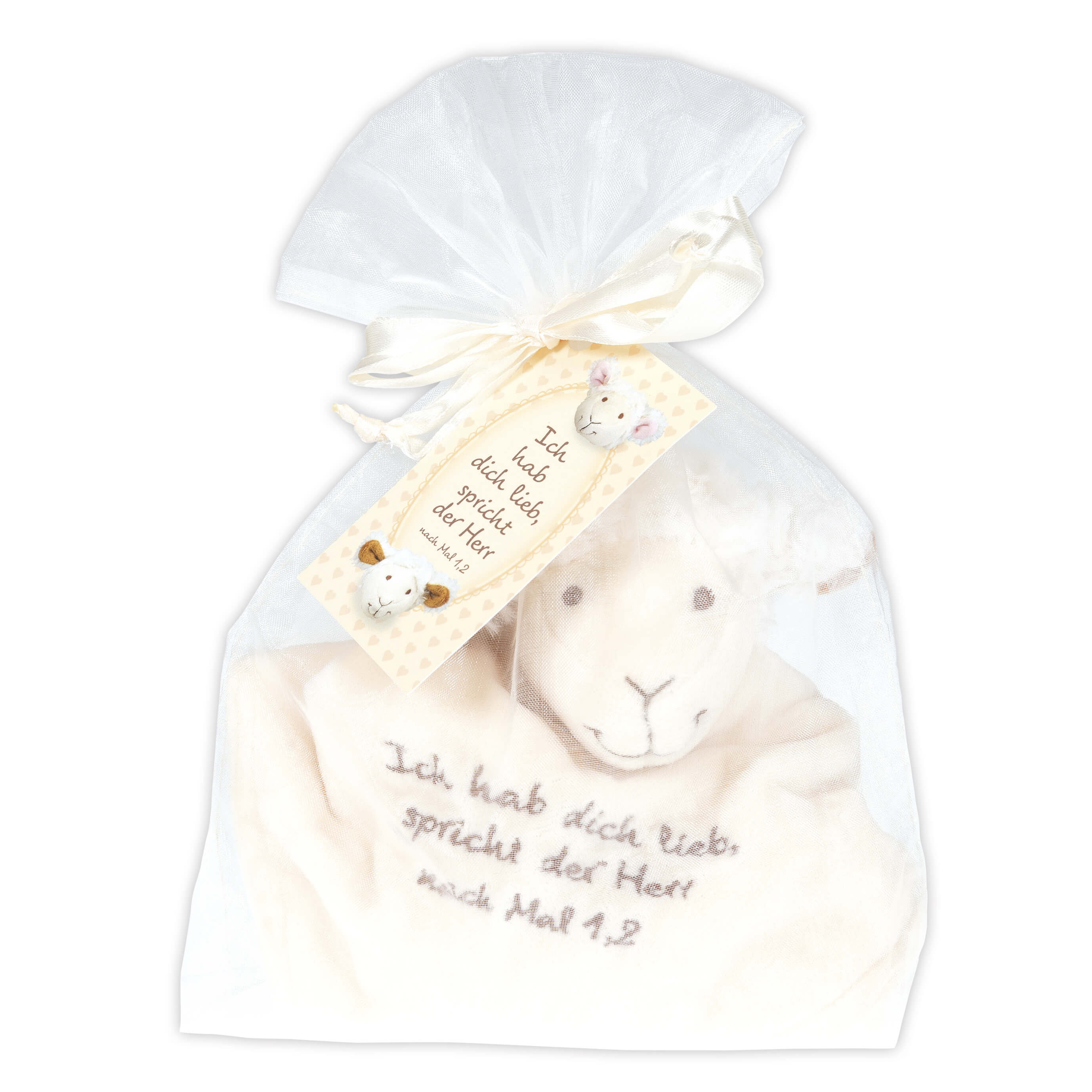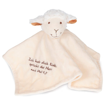Babys erster Freund: Schnuffeltuch bestickt mit "Ich hab dich lieb, spricht der Herr nach Mal 1,2", ca. 30 x 30 cm, in sorgfältiger Handarbeit gefertigt, aus kuschelweichem Plüsch, beige, zertifiziert nach EN71, handwaschbar bei 30 C, verpackt in Organzabeutel.
