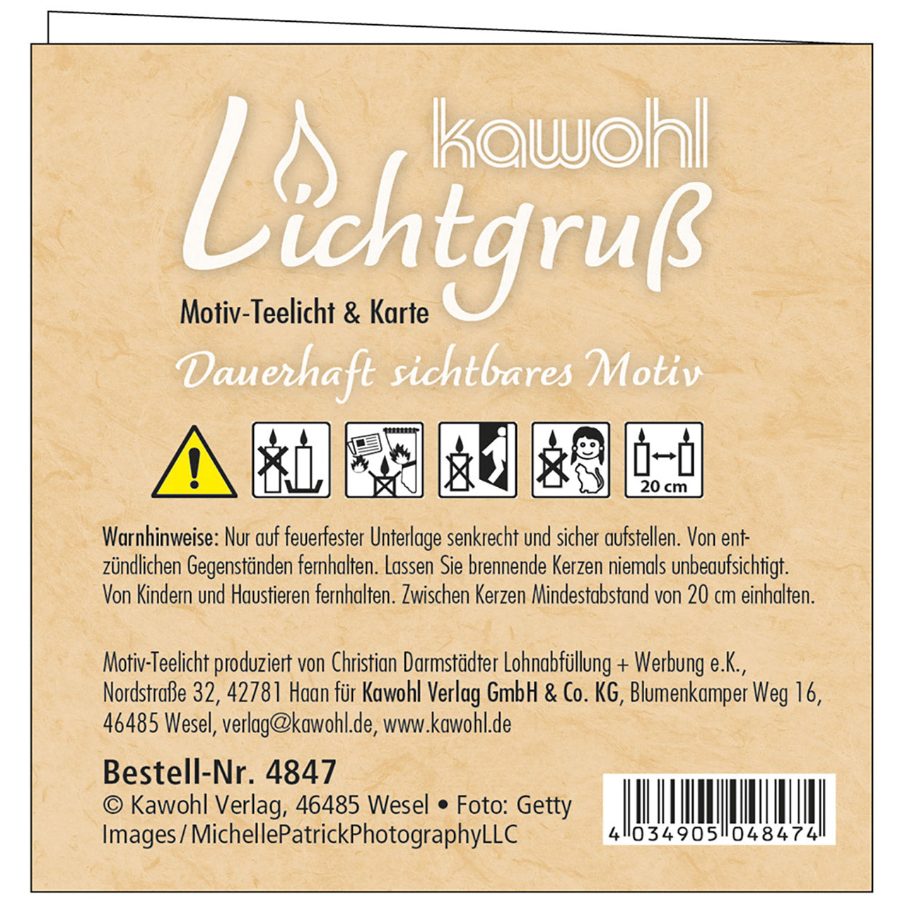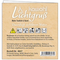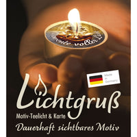 Ein kleiner Lichtgruß mit einer passenden Faltkarte (Format 9 x 9 cm). Das Teelicht ist auf besondere Weise veredelt. Beim Abbrennen schwimmt die Botschaft auf dem flüssigen Wachs und bleibt so - bis auf ein kleines Loch um die Flamme herum - sichtbar.