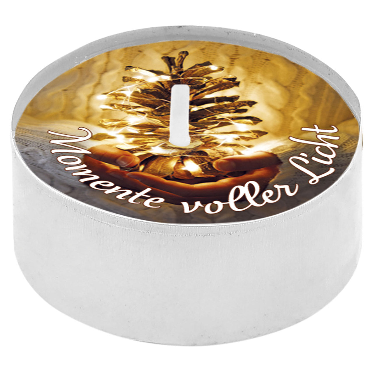 Text auf dem Teelicht: Momente voller Licht