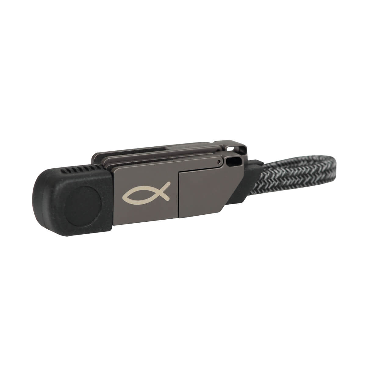 Kompakt zusammensteckbar, aus edlem dunkelgrauen Aluminiumguss mit Lasergravur Fischsymbol.