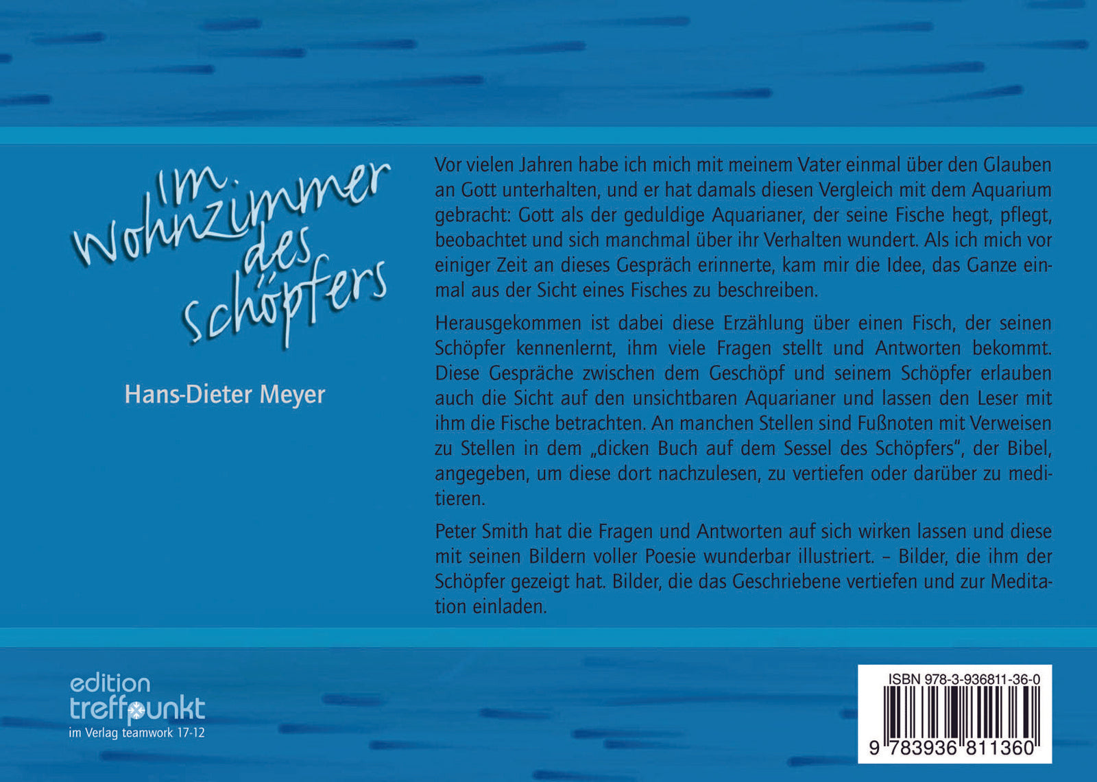 Vor vielen Jahren hat sich Hans-Dieter Meyer mit seinem Vater über den Glauben an Gott unterhalten, und er hat damals diesen Vergleich mit dem Aquarium gebracht: Gott als der geduldige Aquarianer, der seine Fische hegt, pflegt, beobachtet und sich manchmal über ihr Verhalten wundert. Als er sich vor einiger Zeit an dieses Gespräch erinnerte, kam ihm die Idee für dieses Buch: eine Erzählung über einen Fisch, der seinen Schöpfer kennenlernt, ihm viele Fragen stellt und Antworten bekommt. Diese Gespräche zwischen dem Geschöpf und seinem Schöpfer erlauben auch die Sicht auf den unsichtbaren Aquarianer und lassen den Leser mit ihm die Fische betrachten. An manchen Stellen sind Fußnoten mit Verweisen zu Stellen in dem "dicken Buch auf dem Sessel des Schöpfers", der Bibel, angegeben, um diese dort nachzulesen, zu vertiefen oder darüber zu meditieren.