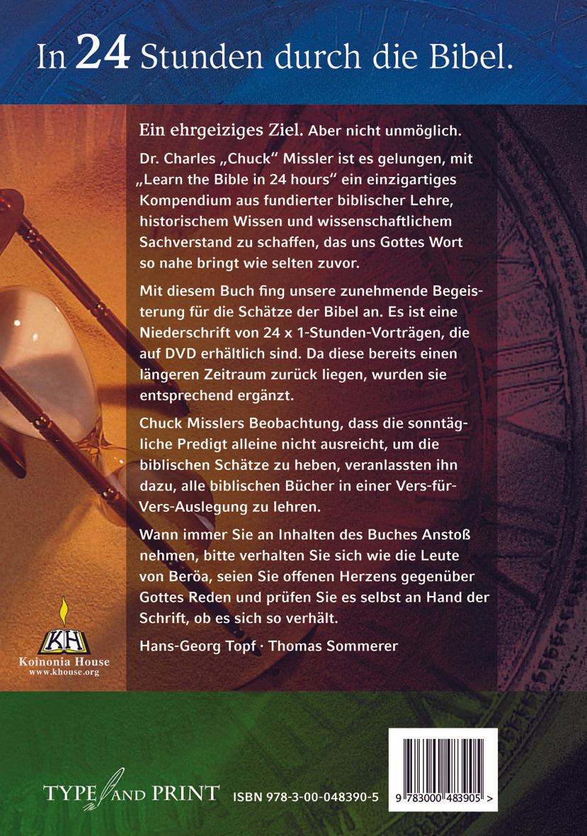 Dr. Charles "Chuck" Missler ist es gelungen, mit "Learn the Bible in 24 hours" ein einzigartiges Kompendium aus fundierter biblischer Lehre, historischem Wissen und wissenschaftlichem Sachverstand zu schaffen, das uns Gottes Wort so nahe bringt wie selten zuvor. Sowohl Einsteiger als auch langjährige Bibelleser können von den 24 kurzen, in meist weniger als einer Stunde zu lesenden Kapiteln profitieren. Neben kurzen Überblicken zu Sachthemen werden die biblischen Bücher zusammengefasst und mit kurzen schwerpunktmäßigen Erklärungen und Auslegungen versehen.