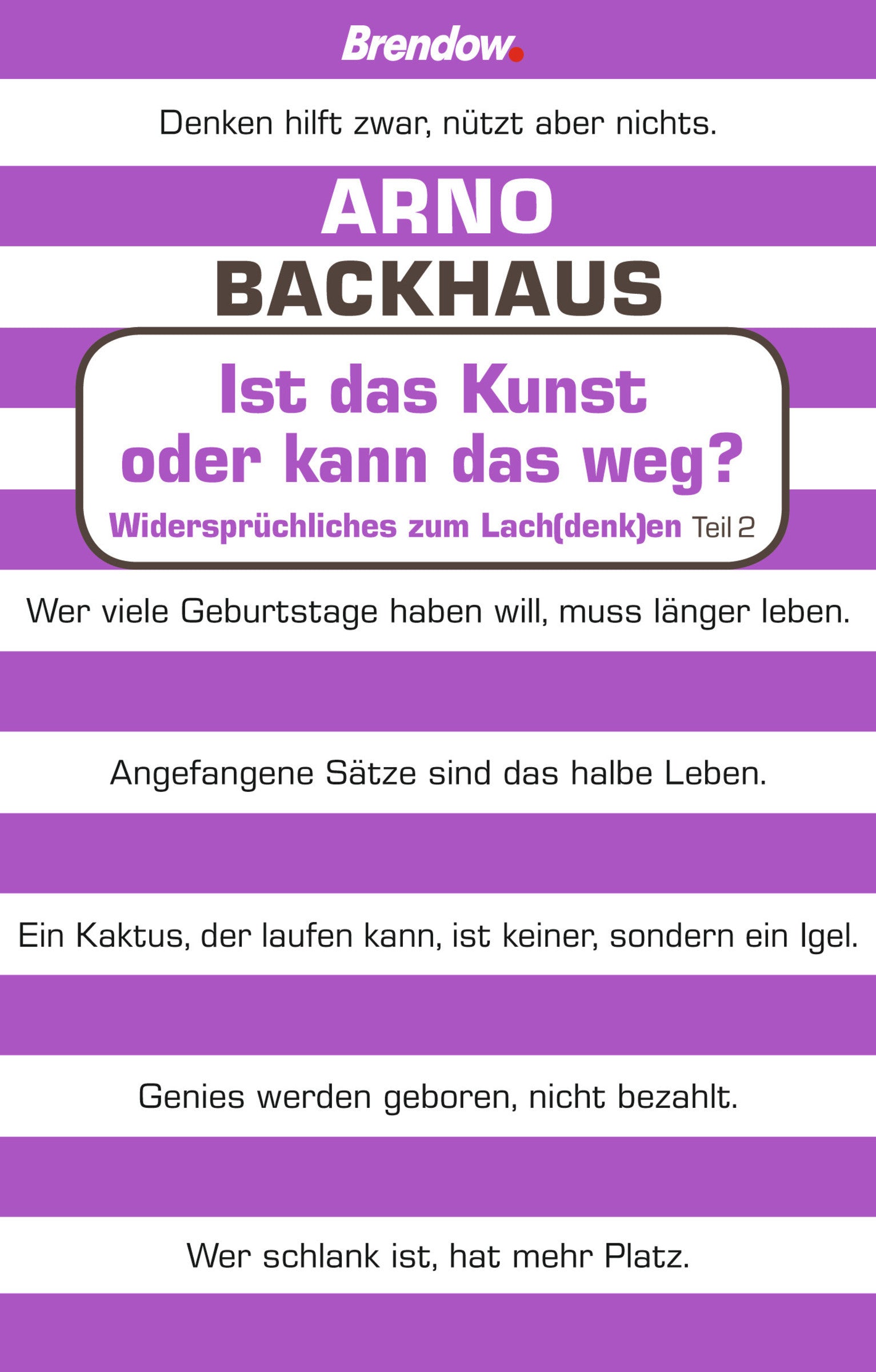 Die Ideen gehen dem kreativen Querdenker Arno Backhaus einfach nicht aus. In "Ist das Kunst oder kann das weg?" versammelt er erneut ein absurdes Sammelsurium an Sprüchen, Aphorismen, Zitaten, Kalauern, Gedankensplittern, Sprichwörtern, Wortspielen und und und. Die ultimative Sprüche-Sammlung zum Selberlesen und Weglachen, Quer-, Nach- und um die-Ecke-Denken, zum Rätseln und Entspannen, als Ideengeber für die nächste Andacht oder Predigt, für die evangelistische Plakat-Aktion oder einfach nur zum Rumstöbern. Mal geistreich-tiefgehend, mal einfach nur witzig aber nie ohne ein Augenzwinkern. Einfach typisch Arno!