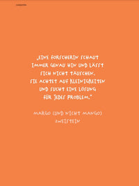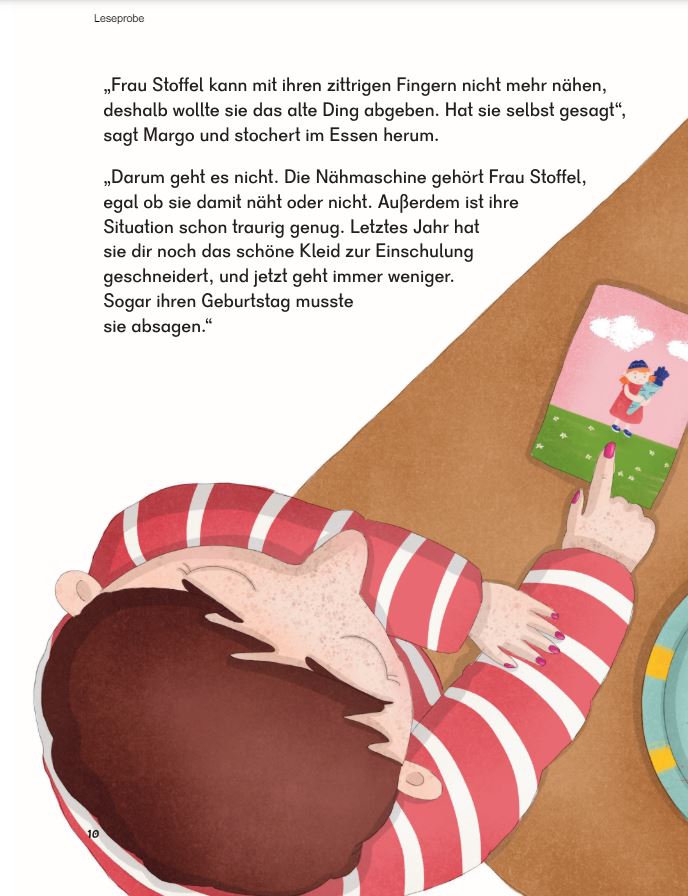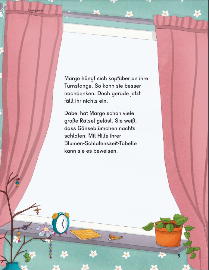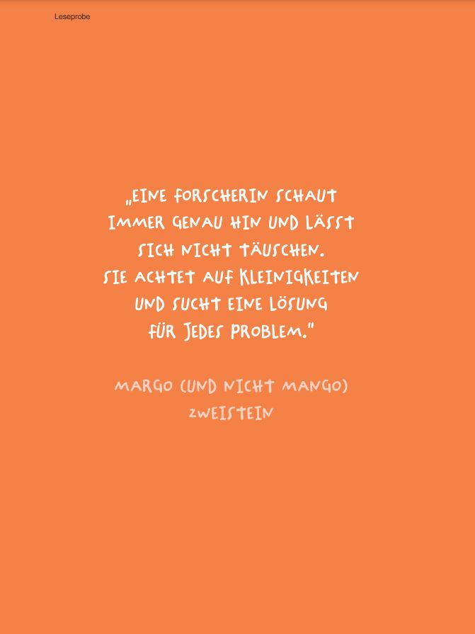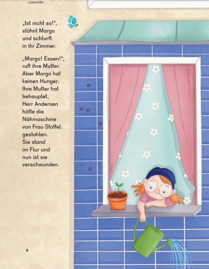 Die siebenjährige Margo ist eine echte Forscherin. Sie liebt Geheimnisse, knifflige Fragen und lässt sich nicht von dem beirren, was andere so behaupten. Sie geht den Dingen auf den Grund, fragt nach und untersucht. In besonders verzwickten Fällen stellt sie sich am liebsten auf den Kopf, um besser nachdenken zu können. Als Frau Stoffel vermutet, dass der neue Bewohner unter dem Dach ihre geliebte Nähmaschine mitgenommen hat, muss Margo etwas unternehmen, denn eines weiß sie ganz genau: So ist es nicht!