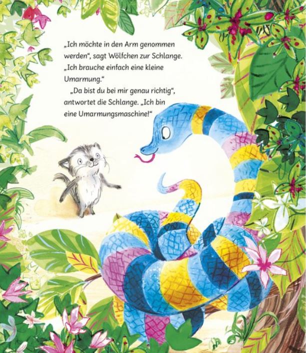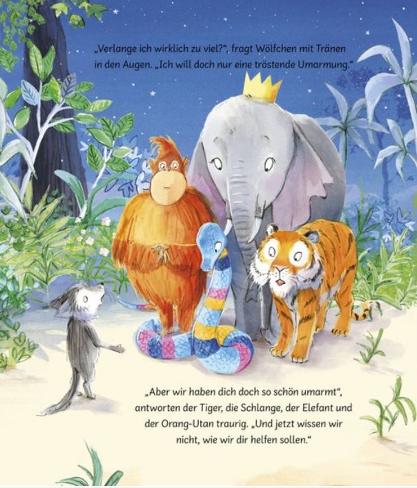 Wölfchen fühlt sich gar nicht gut und möchte einfach mal richtig umarmt werden. Seine Freunde aus dem Dschungel versuchen ihr Bestes. Als erstes ist der Tiger dran, doch das ist nicht das, was sich der kleine Wolf vorgestellt hat. Auch der Elefant, die Schlange und der Orang-Utan schaffen es nicht