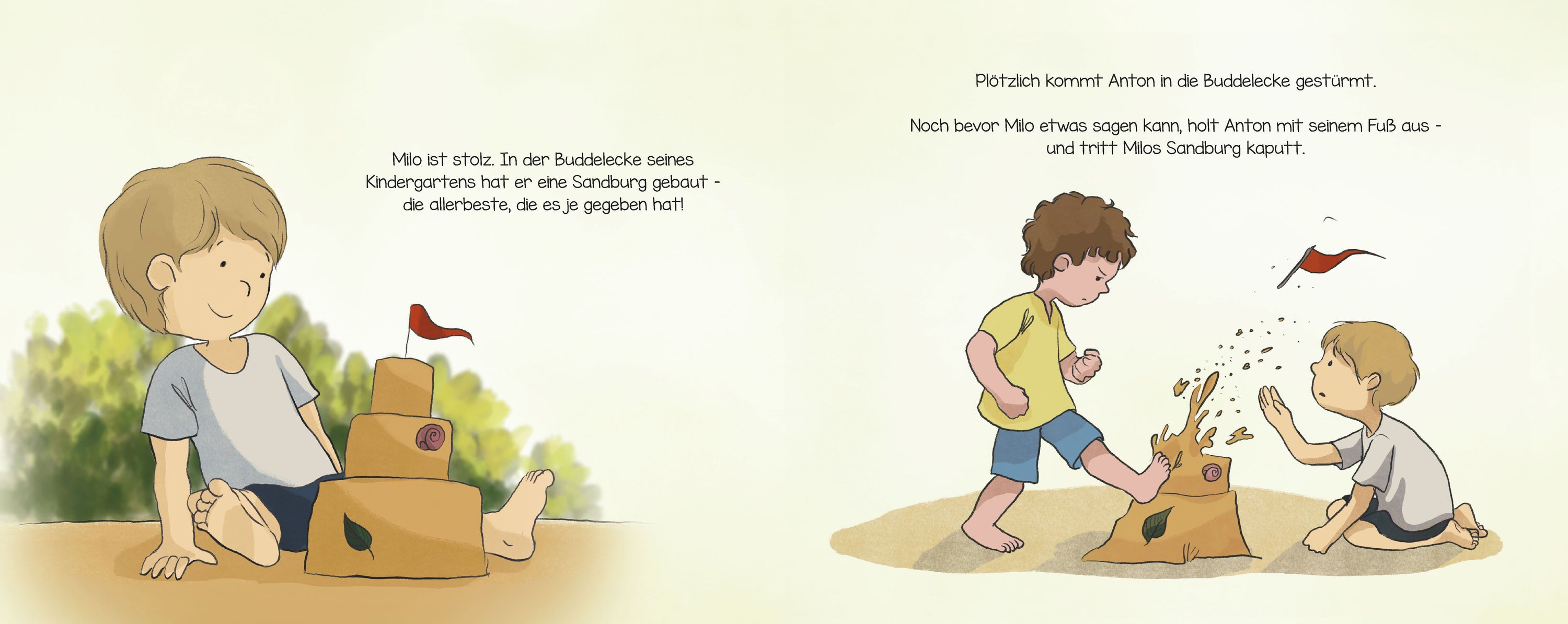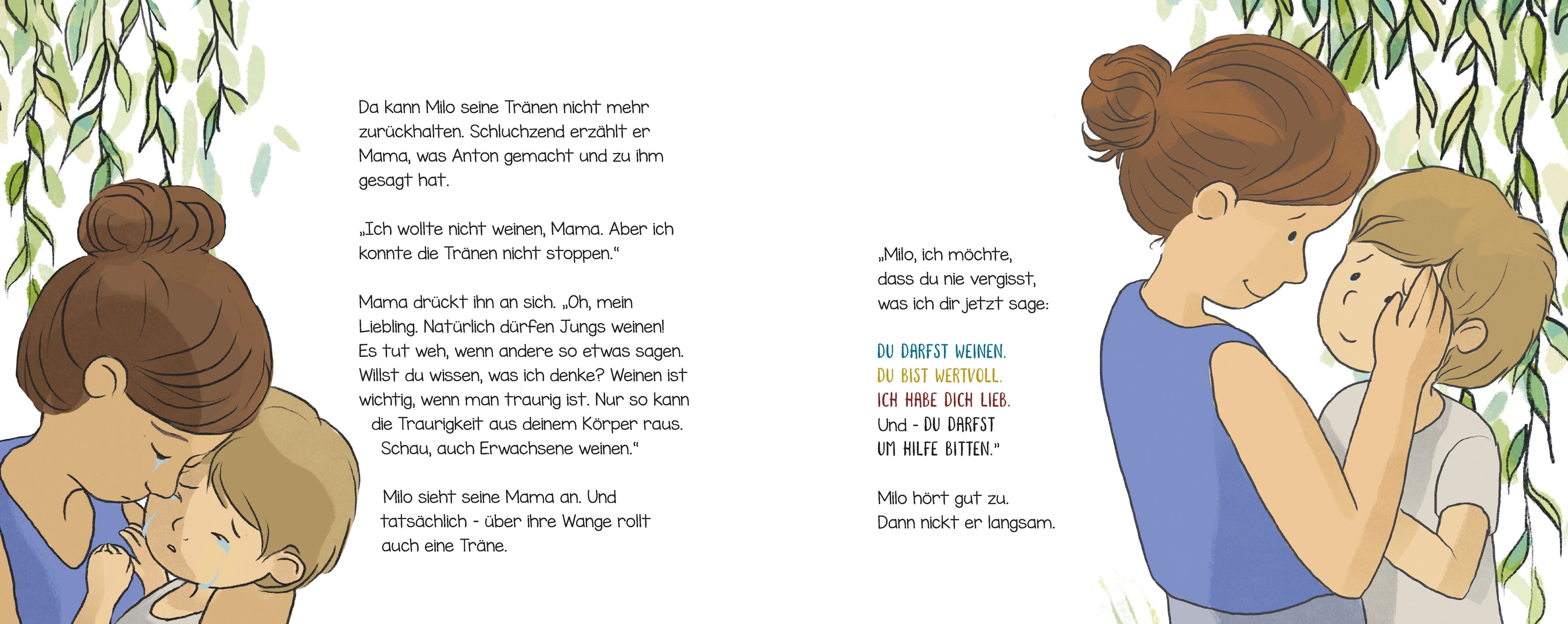 Milo ist traurig. Anton hat seine Sandburg zerstört und ihn beschimpft. Als Tränen über seine Wangen rollen, wischt er sie schnell weg. Niemand soll ihn weinen sehen. Wie gut, dass seine Mama da ist und ihm zeigt, wie wertvoll und geliebt er ist. Von seinen Eltern lernt er, wie wichtig es ist, seine Gefühle zuzulassen.
