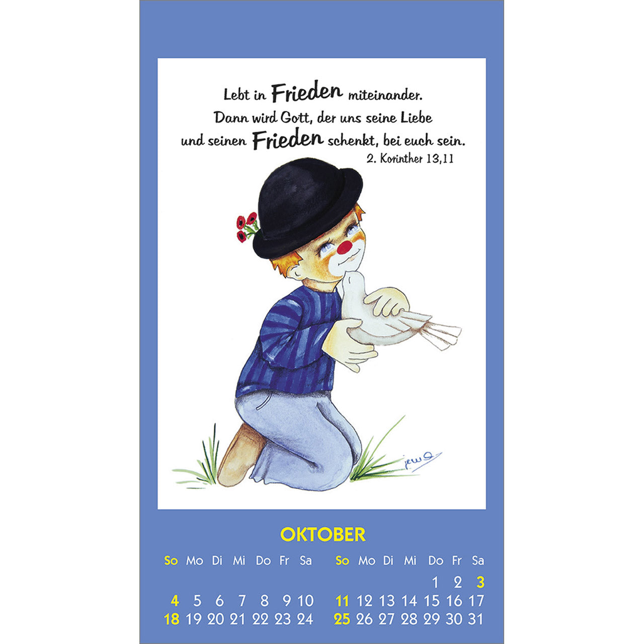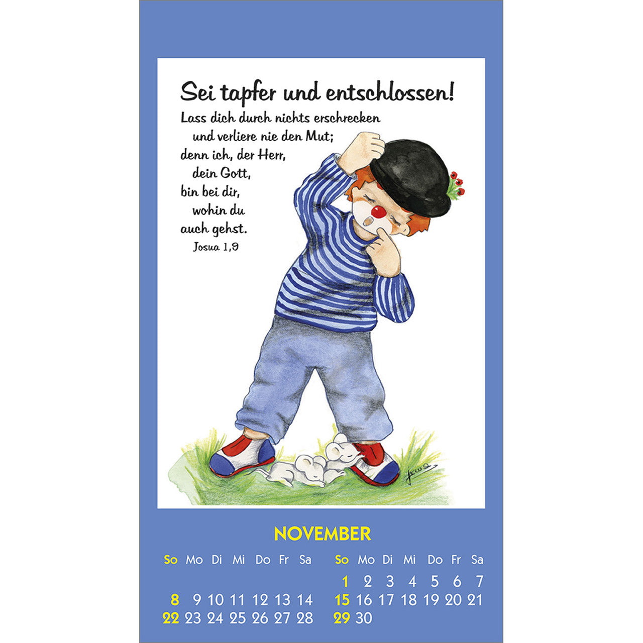 Fröhliche Clown-Motive, mit Liebe zum Detail gezeichnet von Maria Conception Sáenz de Cabezón, und positive christliche Denkanstöße.