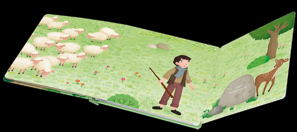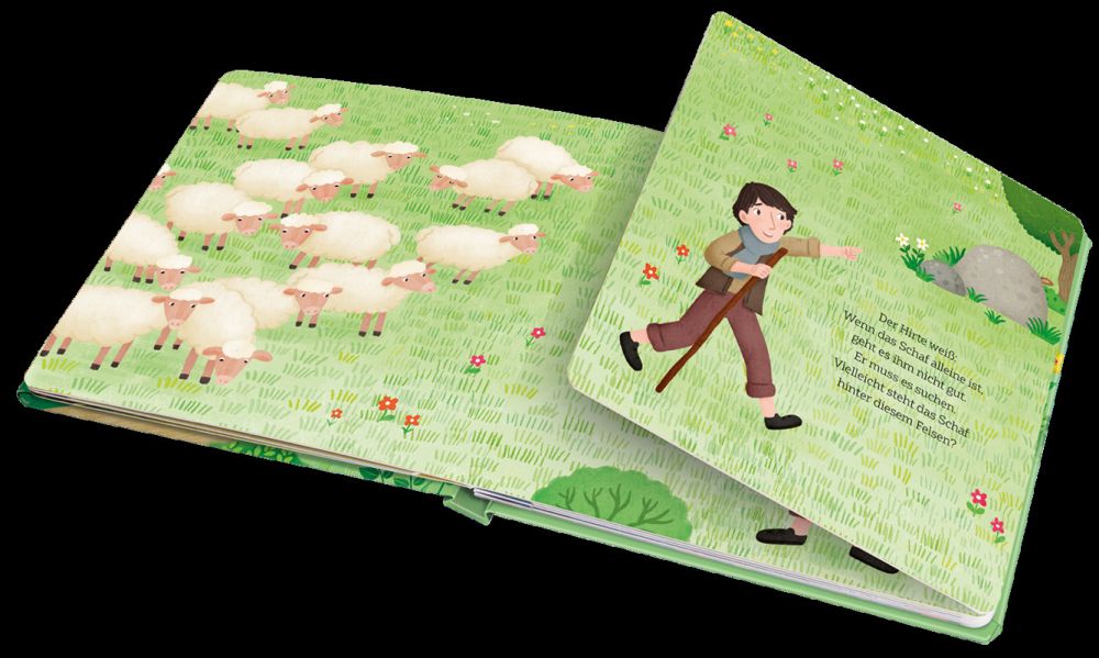 "Jesus erzählt: Ein Hirte hatte 100 Schafe " Nicht nur Kinder lieben die Geschichte vom verlorenen Schaf und dem guten Hirten. Nach jedem Abschnitt der Geschichte kann man einen Teil der Buchseite ausklappen. Ob sich das verlorene Schaf darunter verbirgt? Mit Spannung machen sich die Kleinen mit auf die Suche: Wohin ist das Schaf wohl gelaufen?